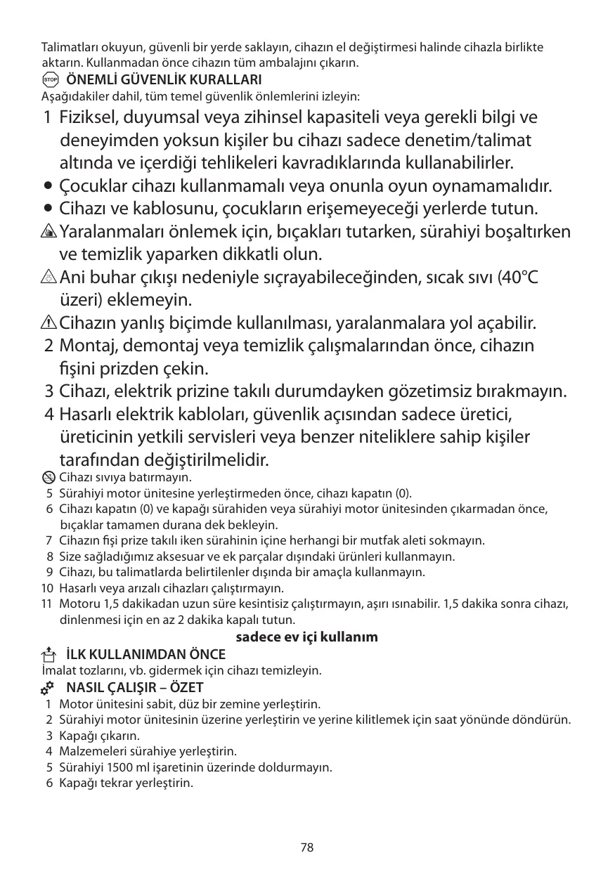 1 Fiziksel, duyumsal veya zihinsel kapasiteli veya gerekli bilgi ve deneyimden yoksun kişiler bu cihazı sadece denetim/talimat altında ve içerdiği tehlikeleri kavradıklarında kullanabilirler. • Çocuklar cihazı kullanmamalı veya onunla oyun oynamamalıdır. • Cihazı ve kablosunu, çocukların erişemeyeceği yerlerde tutun. s Yaralanmaları önlemek için, bıçakları tutarken, sürahiyi boşaltırken ve temizlik yaparken dikkatli olun. u Ani buhar çıkışı nedeniyle sıçrayabileceğinden, sıcak sıvı (40°C üzeri) eklemeyin. c Cihazın yanlış biçimde kullanılması, yaralanmalara yol açabilir. 2 Montaj, demontaj veya temizlik çalışmalarından önce, cihazın fişini prizden çekin. 3 Cihazı, elektrik prizine takılı durumdayken gözetimsiz bırakmayın. 4 Hasarlı elektrik kabloları, güvenlik açısından sadece üretici, üreticinin yetkili servisleri veya benzer niteliklere sahip kişiler tarafından değiştirilmelidir.