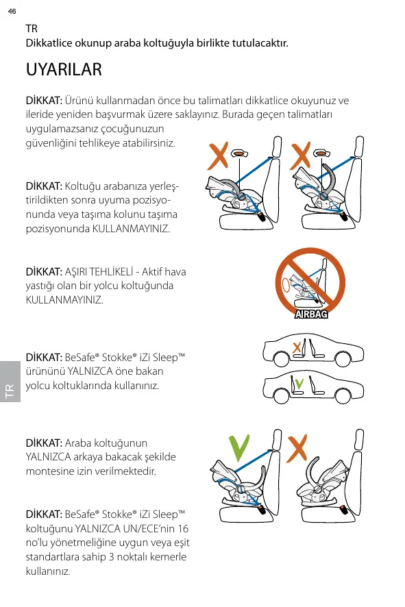 DİKKAT: BeSafe® Stokke® iZi Sleep™ ürününü YALNIZCA öne bakan yolcu koltuklarında kullanınız.