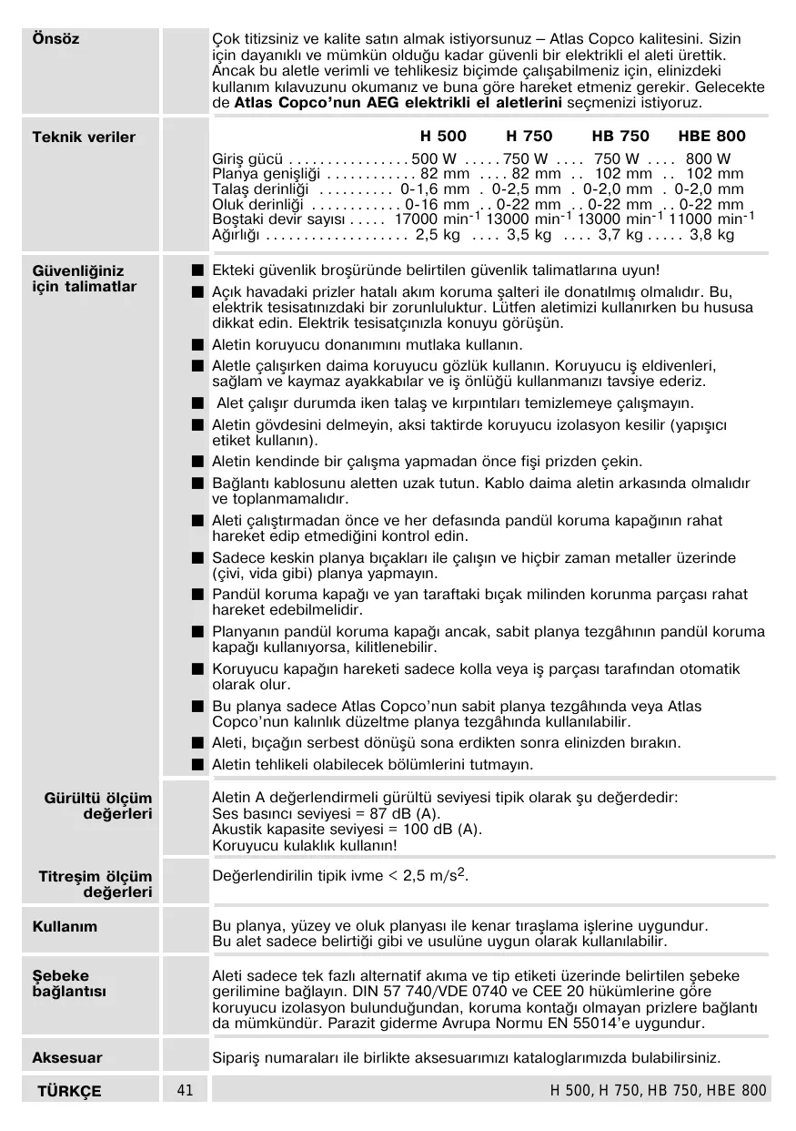 - ,5 kg ,5 kg Bostaki devir sayisi : Aÿirhgi Ekteki güvenlik brosüründe belirtilen güvenlik talimatlarina uyun! AGik havadaki prizler hatali akim koruma salteri ile donatilmis olmalidir. Bu, elektrik tesisatinizdaki bir zorunluluktur. Lütfen aletimizi kullanirken bu hususa dikkat edin. Elektrik tesisatçinizla konuyu gürüsün. Aletin koruyucu donanimini mutlaka kullanin. Aletle çalisirken daima koruyucu gëzlük kullanin. Koruyucu is eldivenleri, saÿlam ve kaymaz ayakkabilar ve is ônlüÿü kullanmaniz tavsiye ederiz. Alet çalisir durumda iken talas ve kirpintlari temizlemeye çalismayin. Aletin gôvdesini delmeyin, aksi taktirde koruyucu izolasyon kesilir (yapisici etiket kullanin). Aletin kendinde bir çalisma yapmadan ônce fisi prizden çekin. Baÿlanti kablosunu aletten uzak tutun. Kablo daima aletin arkasinda olmalidir ve toplanmamalichir. Aleti calistirmadan ônce ve her defasinda pandül koruma kapaÿinin rahat hareket édip etmedigini kontrol edin. Sadece keskin planya biçaklani ile çaligin ve hiçbir zaman metaller üzerinde (Givi, vida gibi) planya yapmayn. Pandül koruma kapadi ve yan taraftaki biçak milinden korunma parçasi rahat hareket edebilmelidir. Planyanin pandül koruma kapaÿi ancak, sabit planya tezgähinin pandül koruma kapaÿ kullamyorsa, kilitlenebilir. Koruyucu kapaÿin hareketi sadece kolla veya is parçasi tarafndan otomatik olarak olur. Bu planya sadece Atlas Copco’nun sabit planya tezgähinda veya Atlas Copco’nun kalnik düzeltme planya tezgähinda kullanilabilir. Aleti, biçaÿin serbest dénüsü sona erdikten sonra elinizden birakin. Aletin tehlikeli olabilecek bélümlerini tutmayin. Aletin À deÿerlendirmeli gürültü seviyesi tipik olarak su degerdedir: Ses basinci seviyesi = 87 dB (A). Akustik kapasite seviyesi = 100 dB (A). Koruyucu kulaklik kullanin! Deëerlendirilin tipik ivme < 2,5 m/s2. Bu planya, yüzey ve oluk planyasi ile kenar traslama islerine uygundur. Bu alet sadece belirtigi gibi ve usulüne uygun olarak Kullanilabilir. Aleti sadece tek fazli alternatif akima ve tip etiketi üzerinde belirtilen sebeke gerilimine baÿlayin. DIN 57 740/VDE 0740 ve CEE 20 hükümlerine gôre Koruyucu izolasyon bulunduÿundan, koruma kontaëi olmayan prizlere baÿlanti da mümkündür. Parazit giderme Avrupa Normu EN 55014'e uygundur. Siparis numaralani ile birlikte aksesuarimiz kataloglanmizda bulabilirsiniz. p. 8