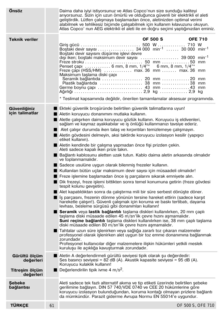 Kølavuz ray için adaptör (Aksesuar* Sipariþ no. 4932 3618 66) Paralellik mesnedini kølavuz koldan sökün ve yerine adaptörü vidalayøn. Kullanøm Aleti iki elinizle iki tutamaktan tutarak, iþ parçasønøn üzerinde eþit ve uygun tempoda hareket ettirin. Adaptör takølarak dik freze kølavuz ray (aksesuar) boyunda hareket ettirilebilir. Bu sayede tam düz frezeleme iþleri yapølabilir. Daima karþøt yönde freze yapøn (þekle bakønøz), aksi takdirde geri tepme tehlikesi ortaya çøkar. Tam düz freze iþleri için kølavuz ray kullanøn. 800 mm uzunluðunda: Sipariþ no. 3932 Freze sütunu aløndøktan sonra bu alet kaløpçø taþlama makinesi olarak da kullanølabilir. Bükülme mili (aksesuar) ile birlikte alet eriþilmesi zor yerlerde de kullanølabilir. Bakøm Aletin havalandørma araløklarønø daima temiz tutun. Sürekli olarak kullanøma hazør olabilmesi için, aletin kömür førçalarønøn yøpranøp yøpranmadøðø yølda bir kez AEG Müþteri Servisi Merkezlerinden birinde kontrol ettirilmelidir. Sadece AEG aksesuarønø ve yedek parçalarønø kullanøn. Deðiþtirilmesi açøklanmamøþ olan parçalarø bir AEG müþteri servisinde deðiþtirin (Garanti broþürüne ve müþteri servisi adreslerine dikkat edin). Gerektiði takdirde aletin daðønøk görünüþ þemasø, alet tipinin ve tip etiketi üzerindeki on hanelik sayønøn bildirilmesi koþuluyla müþteri servisinden veya doðrudan Atlas Copco Electric Tools GmbH, Postfach 32 D-71361 Winnenden adresinden istenebilir.
