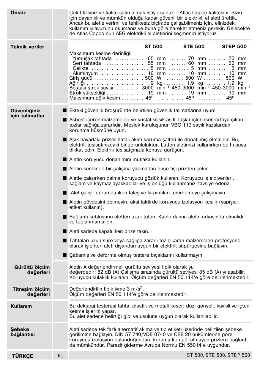 - Teslimat kapsamønda deðildir, önerilen tamamlamalar aksesuar programønda. GERMANY Her iki ucu da døþarø doðru bükün ve plastik kayøcø pabucu aløn. Diðer aksesuarø sipariþ numaralarø ile birlikte kataloglarømøzda bulabilirsiniz. Sürekli olarak kullanøma hazør olabilmesi için, aletin kömür førçalarønøn yøpranøp yøpranmadøðø yølda bir kez AEG Müþteri Servisi Merkezlerinden birinde kontrol ettirilmelidir. Bakøm Sadece AEG aksesuarønø ve yedek parçalarønø kullanøn. Deðiþtirilmesi açøklanmamøþ olan parçalarø bir AEG müþteri servisinde deðiþtirin (Garanti broþürüne ve müþteri servisi adreslerine dikkat edin). Gerektiði takdirde aletin daðønøk görünüþ þemasø, alet tipinin ve tip etiketi üzerindeki on hanelik sayønøn bildirilmesi koþuluyla müþteri servisinden veya doðrudan Atlas Copco Electric Tools GmbH, Postfach 32 D–71361 Winnenden adresinden istenebilir.