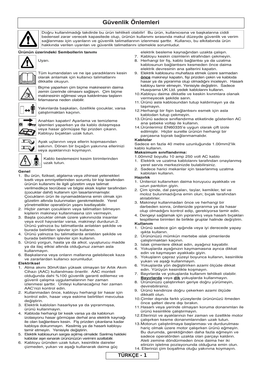 - Bu garanti ek nitelikte olup, müşterinin yasalarca verilmiş haklarını hiçbir şekilde azaltmaz. Aşağıdaki nedenlerden dolayı oluşan arızalar garanti kapsamına girmez; dolayısıyla, bu Çalıştırma Elkitabının içerdiği talimatları okumanız ve makinenizin nasıl çalıştırılması ve bakımının nasıl yapılması gerektiğini öğrenmeniz önemlidir. Aşağıdakiler bu garantinin kapsamına girmez: Yıpranmış ya da hasar görmüş bıçakların değiştirilmesi, Naylon Misina İlk arızanın bildirilmemesi sonucunda oluşan arızalar. Ani darbe sonucunda oluşan arızalar. Ürünün bu Çalıştırma Elkitabında verilen talimatlar ve öneriler uyarınca kullanılmaması sonucunda oluşan arızalar. Kiralık kullandırılan makineler bu garanti kapsanız girmez. Aşağıdaki parçalar aşınan parçalar sayılır ve ömürleri düzenli bakıma bağlı olarak değişir; dolayısıyla bunlar normal olarak geçerli bir garanti talebine tabi değildir: Bıçaklar, Elektrik Kablosu. Dikkat! Husqvarna UK Ltd., kısmen veya tümüyle, dolaylı veya dolaysız olarak, Husqvarna UK Ltd. tarafından üretilmemiş ya da onaylanmamış yedek veya ek parçaların kullanılması ya da makine üzerinde herhangi bir şekilde yapılan değişiklikler nedeniyle oluşan arızalar için garanti kapsamı içinde sorumluluk kabul etmez.
