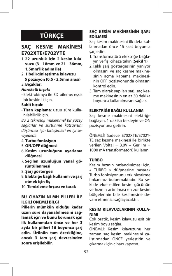 Saç kesme makinesini elektriğe bağlayın, 1 dakika bekleyin ve ON pozisyonuna getirin. ÖNEMLİ! Sadece E702XTE/E702YTE saç kesme makinesi ile birlikte verilen Voltaj = 3,0V – Gerilim = 1000 mA transformatörü kullanın. TURBO Kesim hızının hızlandırılması için, « TURBO » düğmesine basarak Turbo fonksiyonunu etkinleştirme imkanınız bulunmaktadır. Bu şekilde elde edilen kesim gücünün ve hızının artırılması en zor kesim bölgelerinin bile kesilmesine devam etmenizi sağlayacaktır. BU CİHAZIN NI-MH PİLLERİ İLE