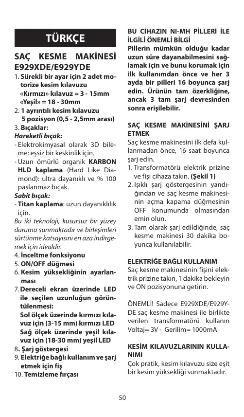 16 heures. 1. B rancher le transformateur sur le secteur et enficher la fiche dans l’appareil. (Fig. 1) 2. Vérifier que le voyant lumineux de charge est bien allumé et que l’interrupteur de la tondeuse est en position OFF. 3. U ne charge complète permet d’utiliser la tondeuse pendant 30 minutes. UTILISATION SUR SECTEUR Brancher la tondeuse sur le secteur, attendre 1 minute et la mettre en position ON. IMPORTANT! Utiliser exclusivement le transfo fourni avec la tondeuse E929XDE/E929YDE Voltage = 3V - Tension = 1000mA UTILISATION DES GUIDES DE COUPE Très pratique, le guide de coupe vous garantit une hauteur de coupe égale. 2