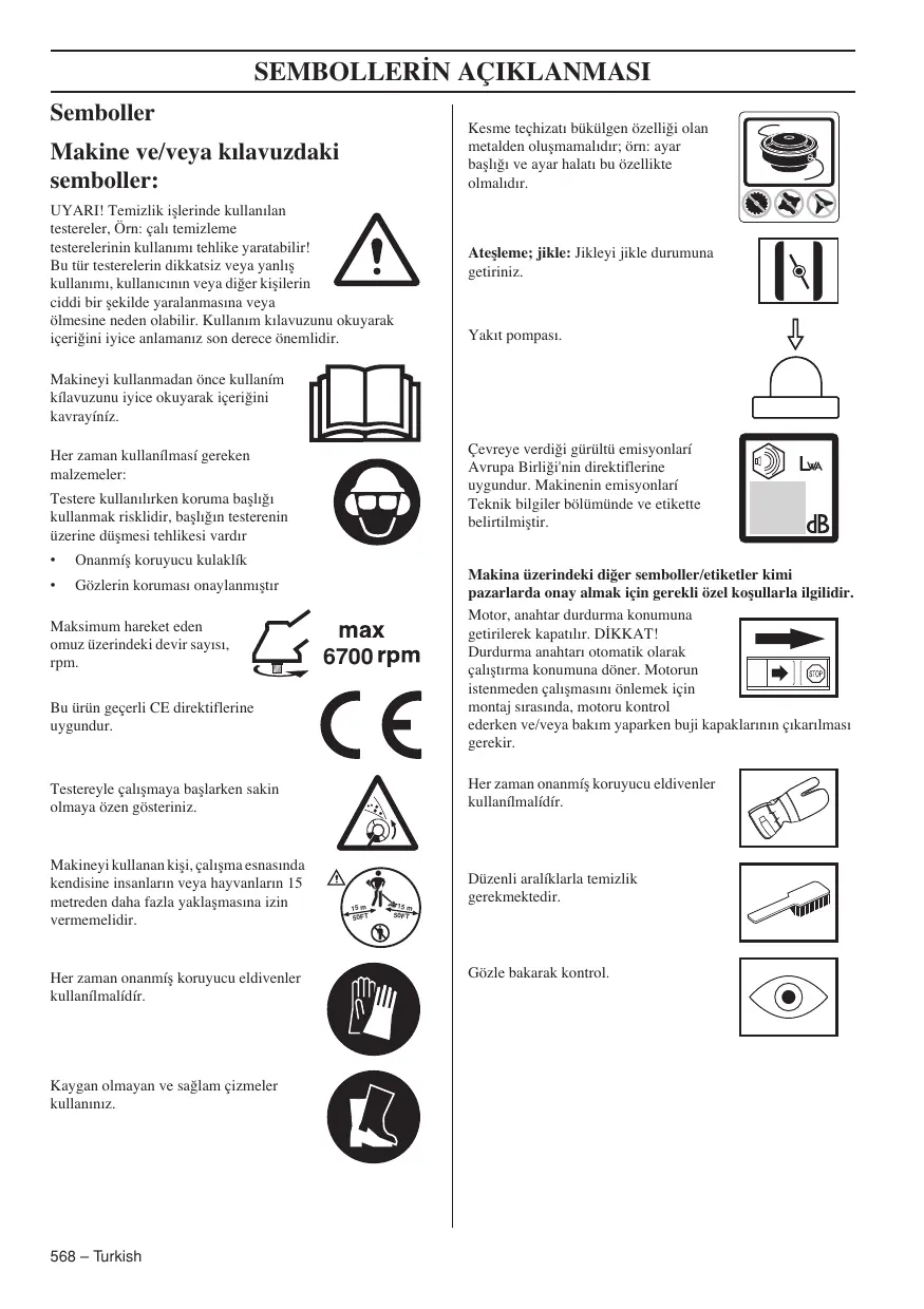 Bu ürün geçerli CE direktiflerine uygundur. Her zaman onanmífl koruyucu eldivenler kullanílmalídír. Testereyle çalıflmaya bafllarken sakin olmaya özen gösteriniz. Makineyi kullanan kifli, çalıflma esnasında kendisine insanların veya hayvanların 15 metreden daha fazla yaklaflmasına izin vermemelidir. Her zaman onanmífl koruyucu eldivenler kullanílmalídír. Kaygan olmayan ve sa¤lam çizmeler kullanınız. 568 – Turkish 15 m 50FT 15 m 50FT Düzenli aralíklarla temizlik gerekmektedir. Gözle bakarak kontrol. ‹Ç‹NDEK‹LER ‹çindekiler