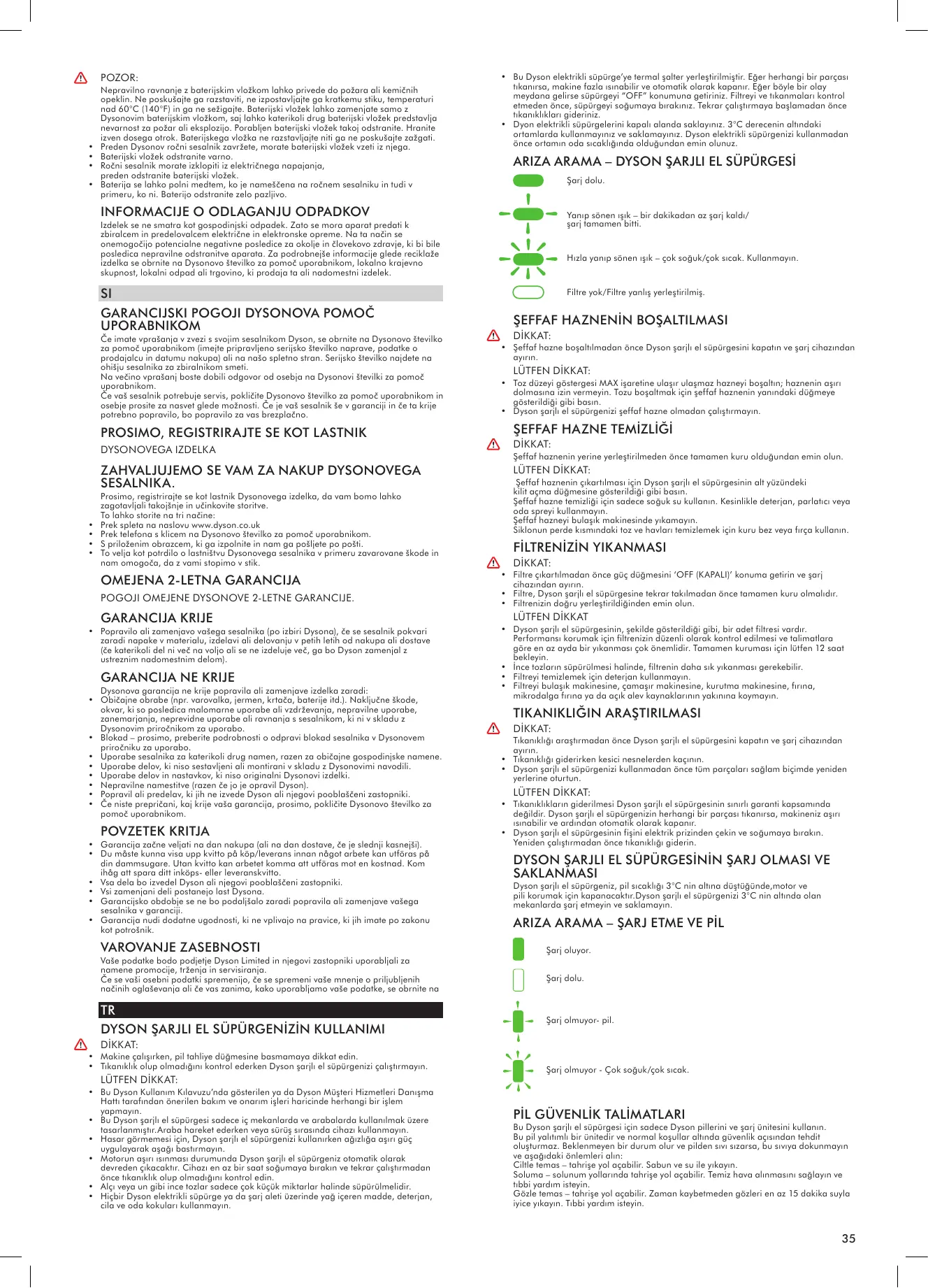 Bu Dyson şarjlı el süpürgesi ve şarj aleti, küçük çocuklar, fiziksel ya da zihinsel özürlü kişiler tarafından, yanlarında kendilerine nezaret edecek ve/veya aletin kullanım talimatlarını kendilerine anlatabilecek bir sorumlu kişi olmadığı takdirde kullanılmamalıdır. Oyuncak olarak kullanılmasına izin vermeyin. Çocuklar tarafından veya onların yanında kullanıldığında çok dikkatli olunmalıdır. şarjlı el süpürgesi veya şarj aleti ile oynamadıklarından emin olmak için çocuklar gözetim altında olmalıdır. Dış ortamlarda, banyoda veya havuza 3 metreden daha yakın bir mesafede, Dyson şarjlı el süpürgesi kesinlikle kurmayın, şarj etmeyin veya kullanmayın. Dyson şarjlı el süpürgesi veya şarj aletini ıslak yüzeylerde kesinlikle kullanmayın ve rutubet, yağmur veya kar yağışına kesinlikle maruz bırakmayın. Cihazı hasarlı kablo veya fişle kullanmayın veya şarj etmeyin. Dyson şarjlı el süpürgesi veya şarj aleti çalışması gerektiği gibi çalışmıyorsa, şiddetli bir darbeye maruz kaldıysa, düşürüldüyse, zarar gördüyse, dış ortamlarda bırakıldıysa veya suya düşürüldüyse kesinlikle kullanmayın ve Dyson Müşteri Hizmetleri DanışmaHattı ile iletişim kurun. Fişi prizden çıkarırken kablosundan çekerek çıkarmayın. Prizden çıkarmak için kablodan değil, fişten tutun. Uzun süre kullanılmayacaksa, şarj aletini prizden çıkarın. Şarj aleti kablosunun, üzerine basılmayacağı, kimsenin takılmayacağı ve hasar görmeyeceği bir yerde bulunduğundan emin olun. Şarj aleti kablosunu kesinlikle germeyin veya gerileceği bir yere koymayın. Kabloyu sıcak yüzeylerden uzak tutun. Islak ellerle, şarj aletinin terminalleri de dahil olmak üzere, şarj aletini veya Dyson şarjlı el süpürgesini kesinlikle tutmayın. Hava giriş ağızlarına herhangi bir nesne koymayın. Hava giriş ağızlarının önü kapalıyken cihazı kullanmayın; toz, hav, saç ve hava akımını engelleyebilecek diğer maddeleri hava giriş ağızlarından uzak tutun. Saçlarınızı, bol giysileri, parmaklarınızı ve bedeninizin diğer tüm uzuvlarını hava giriş ağızlarından ve hareketli parçalardan uzak tutun. Merdivenlerde temizlik yaparken daha dikkatli olun. Benzin gibi alev alıcı veya yanıcı sıvıları çekmek için ya da bu tür sıvıların var olabileceği mekanlarda cihazı kullanmayın. Sigara, kibrit ya da sıcak kül gibi yanmakta olan ya da dumanı tüten hiçbir şeyi çekmek için kullanmayın. Şeffaf hazne ve filtreler takılı olmadan cihazı kullanmayın. Yalnızca bu kılavuzda açıklanan şekilde kullanın. Yalnızca Dyson tarafından önerilen aksesuarları ve yedek parçaları kullanın. Bu kılavuzda gösterilenler ya da Dyson Müşteri Hizmetleri Danışma Hattı tarafından önerilenler haricinde hiç bir bakım ve onarım işlemi yapmayın. Dyson şarjlı el süpürgesi veya şarj aletini kesinlikle söküp açmayın, servis veya tamir gerektiğinde Dyson Müşteri Hizmetleri Danışma Hattı ile iletişim kurun. Cihazın söküldükten sonra hatalı olarak tekrar toplanması, elektrik çarpmasına veya yangına neden olabilir. Temizlik veya bakım yapmadan önce şarj aletini prizden çekin. Uzatma kablosu kullanılması önerilmez. Ağır hasar görmüş bile olsa, Dyson şarjlı el süpürgesini kesinlikle yakmayın. Piller ateşte patlayabilir. Bu Dyson şarjlı el süpürgesi için sadece Dyson pillerini ve şarj ünitesini kullanın. Farklı batarya ve şarj ünitesi kullanımı, patlama riskini ortaya çıkarabilir, şahsi yaralanmalara ve hasara sebep olabilir. Kullanım esnasında, bataryayı makineden ayırma butonuna basmayın.
