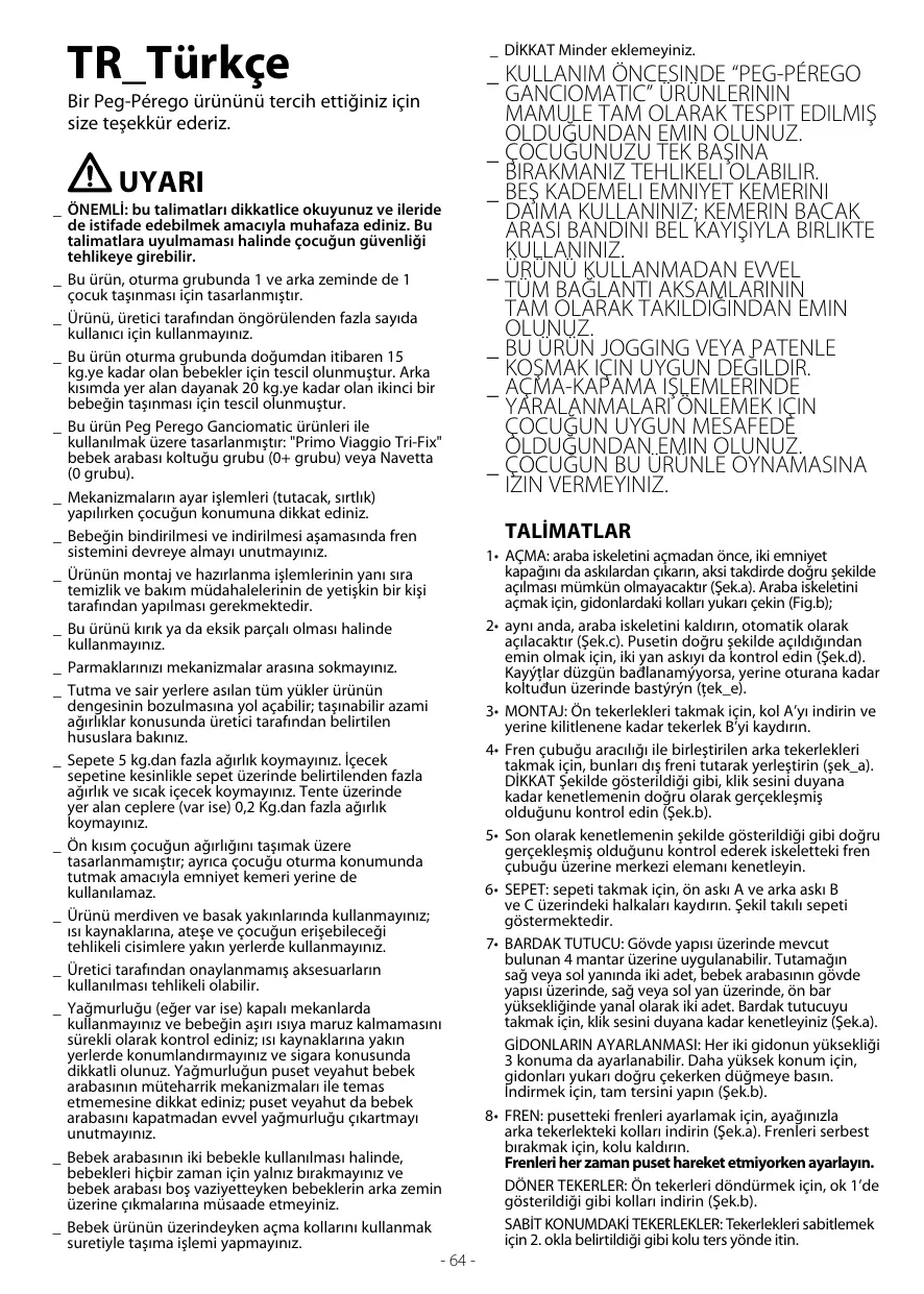 _ Ne pas utiliser lorsque le nombre d’occupants est supérieur aux prescriptions du fabricant. _ Cet article est homologué pour des enfants dans le siège de la naissance jusqu’à un poids de 15 kg. Le marchepied arrière est homologué pour transporter un second enfant dont le poids n’excède pas 20 kg. _ Cet article a été conçu pour être utilisé en combinaison avec les produits Peg Perego Ganciomatic: Siège auto "Primo Viaggio Tri-Fix" (groupe 0+) ou Navetta (groupe 0). _ Prêter attention à la position de l’enfant lors des opérations de réglage des éléments mobiles (poignée, dossier). _ Toujours actionner le frein lorsque l’article est à l’arrêt et pendant l’installation ou la sortie de l’enfant. _ Les opérations d’assemblage, de préparation de l’article, de nettoyage et d’entretien doivent être réalisées uniquement par des adultes. _ Ne pas utiliser cet article si des pièces sont manquantes ou cassées. _ Éviter de mettre les doigts dans les mécanismes. _ Toute charge suspendue aux poignées peut déstabiliser le produit, suivre les recommandations du fabrication sur les charges maximales admises. _ Ne pas utiliser le panier pour transporter des charges dont le poids dépasse 5 kg. Ne pas introduire dans le porte-boisson des charges supérieures à celles indiquées sur le porte-boisson lui-même et ne jamais introduire de boissons chaudes. Ne pas introduire dans les poches de la capote (lorsqu'elles sont présentes) des objets dont le poids dépasse 0.2 kg. _ La main courante n’a pas été conçue pour supporter le poids de l’enfant; elle n’a pas non plus été conçue pour maintenir l’enfant en position assise et ne remplace pas la sangle de sécurité. _ Ne pas utiliser l’article à proximité d’escaliers ou de marches; ne pas l’utiliser à proximité de sources de chaleur, de flammes directes ou d’objets dangereux se trouvant à la portée de l’enfant. _ L’utilisation d’accessoires n’ayant pas été approuvés par le fabricant peut se révéler dangereuse. _ Ne pas utiliser l’habillage pluie (lorsqu’il est présent sur l’article) dans des milieux clos et toujours contrôler que l’enfant n’ait pas trop chaud; ne jamais placer à proximité de sources de chaleur et prendre garde aux cigarettes. S’assurer que l’habillage pluie n’interfère avec aucun mécanisme en mouvement du châssis ou de la poussette; toujours retirer l’habillage pluie avant de refermer le châssis ou la poussette. _ Lorsque la poussette est utilisée avec deux enfants, ne jamais les laisser seuls et ne pas laisser le second enfant monter sur le marchepied arrière tandis que la poussette est vide.