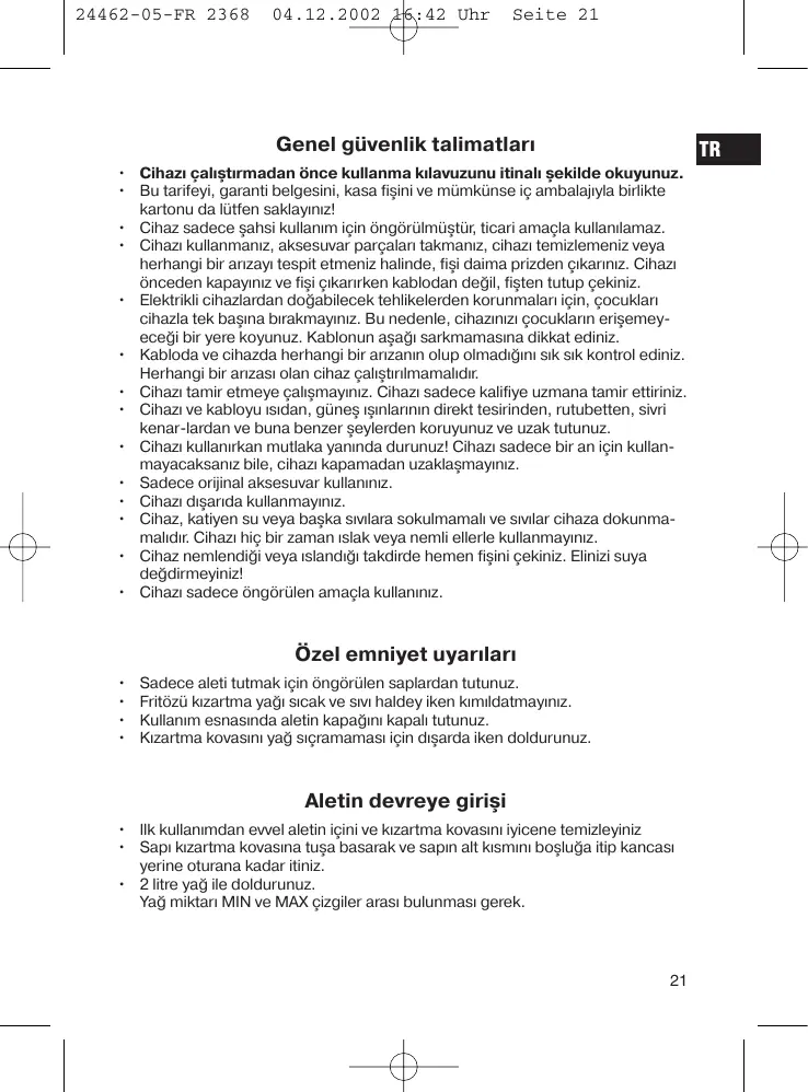 • Cihazı çalıştırmadan önce kullanma kılavuzunu itinalı şekilde okuyunuz. • Bu tarifeyi, garanti belgesini, kasa fişini ve mümkünse iç ambalajıyla birlikte kartonu da lütfen saklayınız! • Cihaz sadece şahsi kullanım için öngörülmüştür, ticari amaçla kullanılamaz. • Cihazı kullanmanız, aksesuvar parçaları takmanız, cihazı temizlemeniz veya herhangi bir arızayı tespit etmeniz halinde, fişi daima prizden çıkarınız. Cihazı önceden kapayınız ve fişi çıkarırken kablodan değil, fişten tutup çekiniz. • Elektrikli cihazlardan doğabilecek tehlikelerden korunmaları için, çocukları cihazla tek başına bırakmayınız. Bu nedenle, cihazınızı çocukların erişemeyeceği bir yere koyunuz. Kablonun aşağı sarkmamasına dikkat ediniz. • Kabloda ve cihazda herhangi bir arızanın olup olmadığını sık sık kontrol ediniz. Herhangi bir arızası olan cihaz çalıştırılmamalıdır. • Cihazı tamir etmeye çalışmayınız. Cihazı sadece kalifiye uzmana tamir ettiriniz. • Cihazı ve kabloyu ısıdan, güneş ışınlarının direkt tesirinden, rutubetten, sivri kenar-lardan ve buna benzer şeylerden koruyunuz ve uzak tutunuz. • Cihazı kullanırkan mutlaka yanında durunuz! Cihazı sadece bir an için kullanmayacaksanız bile, cihazı kapamadan uzaklaşmayınız. • Sadece orijinal aksesuvar kullanınız. • Cihazı dışarıda kullanmayınız. • Cihaz, katiyen su veya başka sıvılara sokulmamalı ve sıvılar cihaza dokunmamalıdır. Cihazı hiç bir zaman ıslak veya nemli ellerle kullanmayınız. • Cihaz nemlendiği veya ıslandığı takdirde hemen fişini çekiniz. Elinizi suya değdirmeyiniz! • Cihazı sadece öngörülen amaçla kullanınız.