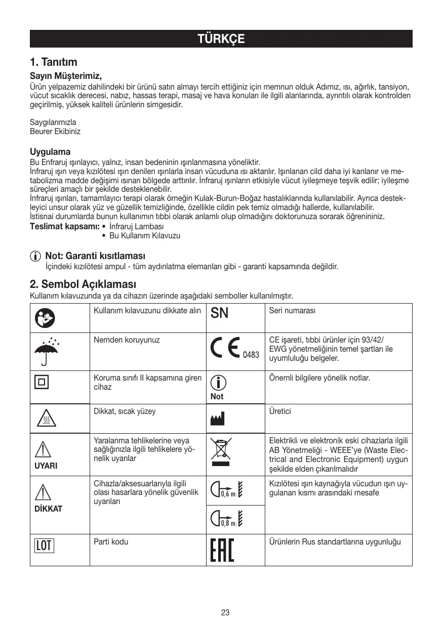 • Bu Enfraruj ışınlayıcı, yalnız, insan bedeninin ışınlanmasına yöneliktir. • Kullanmadan önce cihazın ve aksesuarların görülebilir arızaları olmadığından ve her türlü ambalaj malzemesinin çıkarıldığından emin olunmalıdır. Emin olmadığınız durumlarda cihazı kullanmadan önce satıcınıza ya da ilgili müşteri servisi adresine başvurunuz. • Aletinizin sağlam ve düz bir zemin üzerinde durmasına dikkat ediniz. • Lambanın gövdesi ve enfraruj lambanın kendisi çalışma esnasında çok ısınır. Temas halinde yanma tehlikesi söz konusudur! Lambaya dokunmadan önce, soğumasını bekleyiniz. • Yanıcı eşya ve maddeler ile infraruj lambası arasında en azından 1,0 m mesafe bırakılması gerekir. Aleti duvara takmayınız veya tavana asmayınız. • Cihaz sadece üzerinde belirtilen elektrik voltaj düzeyine bağlanabilir. • Cihazı suya sokmayınız ve cihazı ıslak alanlarda kullanmayınız. • Bu cihaz, fiziksel, sensörik, zihinsel veya ruhsal yetenekleri sınırlı olan veya cihaz hakkında yeterince tecrübesi ve/ veya bilgisi olmayan kişiler (çocuklar da dahil) tarafından kullanılmamalıdır; ancak bu kişiler kendi güvenliklerinden sorumlu bir kişi tarafından denetlenirse veya kendilerine cihazın nasıl kullanılacağı hakkında yeterli bilgi ve eğitim verilirse, cihazı kullanmalarına izin verilebilir. Çocuklar, cihazla oynamamaları için denetlenmelidir. • Isıya karşı hassasiyeti olmayan insanlarda bu aleti kullanmayınız. Isıya karşı duyarlılık, aşağıdaki durumlarda sınırlı veya artmış olabilir: – Diabet Hastalarında – Uykulu olma hali, bunaması veya konsantrasyon bozukluğu bulunan kişilerde – Herhangi bir hastalığa bağlı olarak cilt bozulmaları olan kişilerde. Uygulama alanında iyileşmiş yara izi bulunan şahıslarda – Allerjileri olan şahıslarda – Çocuk ve yaşlılarda – Alkollü içecek veya ilaç alımından sonra • Akut iltihaplı rahatsızlıklarda, ancak doktor ile görüşüldükten sonra, doktorun izni alınarak lamba ile ışınlama işlemi yapılmalıdır. • Uygulama süresini sürekli sınırlı tutunuz ve cildin tepkisini kontrol ediniz. • İlaçlar, kosmetik malzemeler veya gıda maddeleri, kimi durumlarda,cildin allerjik reaksiyon veya aşırı duyarlılık göstermesine neden olabilirler. Böyle bir durumda, ışınlama derhal kesilmelidir. • Gerecin sürekli çalışması durumunda, özel bir özen gösterilmesi ve dikkat edilmesi önerilir ve bir ışınlama sırasında asla uyunmamalıdır. • Çok uzun süreli kullanım, ciltte yanmaya sebep olabilir. • İnfraruj lambası hala elektriğe takılı ise, ona el sürmeyiniz veya onu sökmeye kalkışmayınız. • Çocuklar, elektrikli aletlerden kaynaklanabilecek tehlikeleri bilememektedir. Nezaret altında olmaksızın aletin çocuklar tarafından kullanılmasına izin vermeyiniz. • Alet sadece bir insanın nezaretinde kullanılmalıdır. •Ç ocukları ambalaj malzemesinden uzak tutunuz (boğulma tehlikesi!). • Isınmış halde cihazın üstü kapatılamaz, cihaz sarılamaz ya da paketlenerek muhafaza edilemez. • Cihaza dokunmadan önce daima cihazın fişini prizden çekiniz ve cihazın soğumasını bekleyiniz. • Pirize bağlı haldeyken cihaza ıslak ellerle dokunulmamalıdır; cihaza su sıçratılmamalıdır. Cihaz sadece tamamen kuru haldeyken çalıştırılabilir. • Cihazı güçlü darbelerden koruyunuz. • Cihazın fişini prizden çekmek için cihazın kablosundan çekmeyiniz. • Cihazda arıza veya işlev bozuklukları olması durumunda, cihazı derhal kapatınız ve cihazın fişini çekip prizden çıkararak, elektrik bağlantısını kesiniz. Cihazın elektrik kablosu bozuk veya hasarlı ise, kablonun üretici veya yetkili bir servis merkezi tarafından değiştirilmesi gerekir. • Cihazın elektrik akımından ayrılması ancak fişin prizden çekilmesiyle sağlanabilir. • Bebek ve çocuklarda güç kablosuna dolaşarak boğulma tehlikesi vardır.