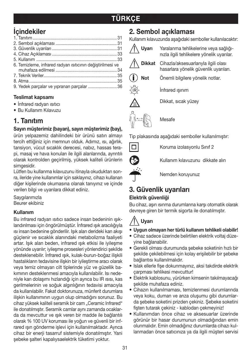 > 30 cm Mesafe Sayın müşterimiz (bayan), sayın müşterimiz (bay), ürün yelpazemiz dahilindeki bir ürünü satın almayı tercih ettiğiniz için memnun olduk. Adımız, ısı, ağırlık, tansiyon, vücut sıcaklık derecesi, nabız, hassas terapi, masaj ve hava konuları ile ilgili alanlarında, ayrıntılı olarak kontrolden geçirilmiş, yüksek kaliteli ürünlerin simgesidir. Lütfen bu kullanma kılavuzunu itinayla okuduktan sonra, ileride yine kullanımlar için saklayınız, cihazı kullanan diğer kişilerinde okumasına olanak tanıyınız ve içinde verilen bilgi ve uyarılara dikkat ediniz. Tip plakasında aşağıdaki semboller kullanılmıştır: Saygılarımızla Beurer ekibiniz Elektrik güvenliği Koruma izolasyonlu Sınıf 2 Kullanım kılavuzunu dikkate alın Nemden koruyunuz