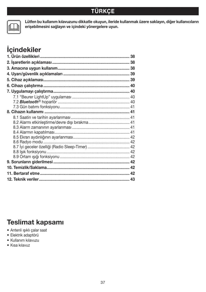Table des matières 1. Familiarisation avec l'appareil 17 2. Symboles utilisés 17 3. Utilisation conforme aux recommandations 17 4. Consignes de sécurité 18 5. Description de l'appareil 18 6. Mise en service de l'appareil 19 7. Mise en service de l'application 19 7.1 Application Beurer LightUp 19 7.2 Haut-parleur Bluetooth® 19 7.3 Fonction coucher de soleil 20 8. Utilisation de l'appareil 20 8.1 Régler l'heure et la date 20 8.2 Activer/désactiver l'alarme 20 8.3 Réglage de l'heure de l'alarme 20 8.4 Désactivation de l'alarme 21 8.5 Réglage de la luminosité de l'écran 21 8.6 Mode radio 21 8.7 Fonction bonne nuit (radio sleep timer) 21 8.8 Fonction lumière 21 • Activation ou désactivation du bip des touches • Activation du coucher de soleil Configuration requise : • Bluetooth® 4.0, iOS à partir de la version 7.1, appareils Android™ à partir de la version 4.3 avec Bluetooth® Smart Ready Pour obtenir la liste des appareils mobiles compatibles, veuillez scanner le code QR suivant :