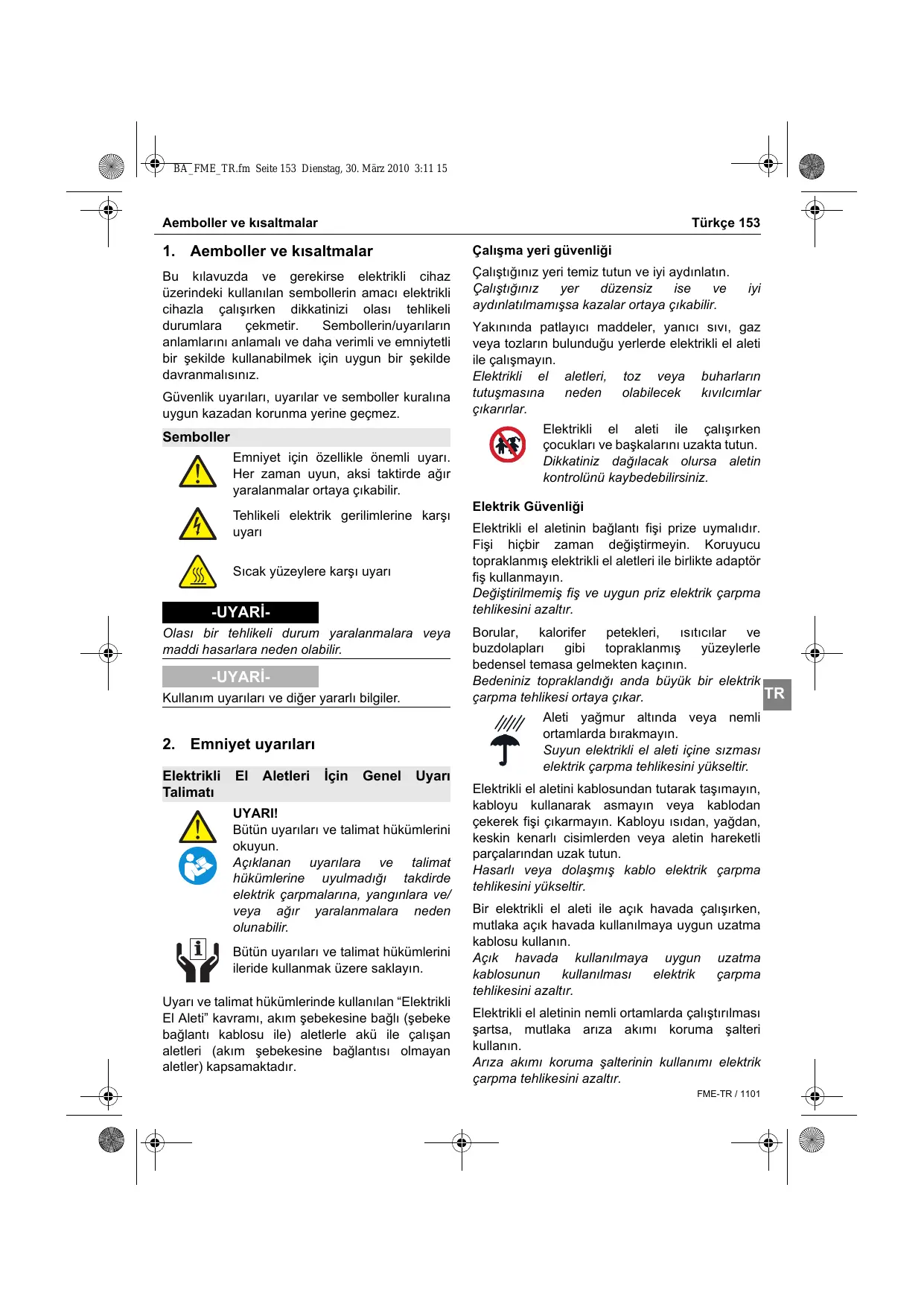 Aletleri İçin Genel Uyarı UYARI! Bütün uyarıları ve talimat hükümlerini okuyun. Açıklanan uyarılara ve talimat hükümlerine uyulmadığı takdirde elektrik çarpmalarına, yangınlara ve/ veya ağır yaralanmalara neden olunabilir. Bütün uyarıları ve talimat hükümlerini ileride kullanmak üzere saklayın. Uyarı ve talimat hükümlerinde kullanılan “Elektrikli El Aleti” kavramı, akım şebekesine bağlı (şebeke bağlantı kablosu ile) aletlerle akü ile çalışan aletleri (akım şebekesine bağlantısı olmayan aletler) kapsamaktadır. iyi Yakınında patlayıcı maddeler, yanıcı sıvı, gaz veya tozların bulunduğu yerlerde elektrikli el aleti ile çalışmayın. Elektrikli el aletleri, toz veya buharların tutuşmasına neden olabilecek kıvılcımlar çıkarırlar. Elektrikli el aleti ile çalışırken çocukları ve başkalarını uzakta tutun. Dikkatiniz dağılacak olursa aletin kontrolünü kaybedebilirsiniz. Elektrik Güvenliği Elektrikli el aletinin bağlantı fişi prize uymalıdır. Fişi hiçbir zaman değiştirmeyin. Koruyucu topraklanmış elektrikli el aletleri ile birlikte adaptör fiş kullanmayın. Değiştirilmemiş fiş ve uygun priz elektrik çarpma tehlikesini azaltır. Borular, kalorifer petekleri, ısıtıcılar buzdolapları gibi topraklanmış yüzeylerle bedensel temasa gelmekten kaçının. Bedeniniz topraklandığı anda büyük bir elektrik çarpma tehlikesi ortaya çıkar. Aleti yağmur altında veya nemli ortamlarda bırakmayın. Suyun elektrikli el aleti içine sızması elektrik çarpma tehlikesini yükseltir. Elektrikli el aletini kablosundan tutarak taşımayın, kabloyu kullanarak asmayın veya kablodan çekerek fişi çıkarmayın. Kabloyu ısıdan, yağdan, keskin kenarlı cisimlerden veya aletin hareketli parçalarından uzak tutun. Hasarlı veya dolaşmış kablo elektrik çarpma tehlikesini yükseltir. Bir elektrikli el aleti ile açık havada çalışırken, mutlaka açık havada kullanılmaya uygun uzatma kablosu kullanın. Açık havada kullanılmaya uygun uzatma kablosunun kullanılması elektrik çarpma tehlikesini azaltır. Elektrikli el aletinin nemli ortamlarda çalıştırılması şartsa, mutlaka arıza akımı koruma şalteri kullanın. Arıza akımı koruma şalterinin kullanımı elektrik çarpma tehlikesini azaltır. FME-TR / 1101 BA_FME_TR.fm Seite 154 Dienstag, 30. März 2010 3:11 15 154 Türkçe Emniyet uyarıları Kişilerin Güvenliği Dikkatli olun, ne yaptığınıza dikkat edin, elektrikli el aleti ile işinizi makul bir tempo ve yöntemle yürütün. Yorgunsanız, aldığınız hapların, ilaçların veya alkolün etkisinde iseniz elektrikli el aleti kullanmayın. Aleti kullanırken bir anki dikkatsizlik önemli yaralanmalara neden olabilir. Daima kişisel koruyucu donanım ve bir koruyucu gözlük kullanın. Elektrikli el aletinin türü ve kullanmna uygun olarak; toz maskesi, kaymayan iş ayakkabıları, koruyucu kask veya koruyucu kulaklık gibi koruyucu donanım kullanımı yaralanma tehlikesini azalttır. Aleti yanlışlıkla çalıştırmaktan kaçının. Akım ikmal şebekesine ve/ veya aküye bağlamadan, elinize alıp taşımadan önce elektrikli el aletinin kapalı durumda olduğundan emin olun. Elektrikli el aletini parmağınız şalter üzerinde dururken taşırsanız ve alet açıkken fişi prize sokarsanız kazalara neden olabilirsiniz. TR Elektrikli el aletini çalıştırmadan önce ayar aletlerini veya anahtarları aletten çıkarın. Aletin dönen parçaları içinde bulunabilecek bir yardımcı alet yaralanmalara neden olabilir. Çalışırken bedeniniz anormal durumda olmasın. Çalışırken duruşunuz güvenli olsun ve dengenizi her zaman koruyun. Bu sayede aleti beklenmedik durumlarda daha iyi kontrol edebilirsiniz. Uygun iş elbiseleri giyin. Geniş giysiler giymeyin ve takı takmayın. Saçlarınızı, giysileriniz ve eldivenlerinizi aletin hareketli parçalarından uzak tutun. Bol giysiler, uzun saçlar veya takılar aletin hareketli parçaları tarafından tutulabilir. Toz emme donanımı veya toz tutma tertibatı kullanırken, bunların bağlı olduğundan ve doğru kullanıldığından emeni olun. Toz emme donanımının kullanımı tozdan kaynalanabilecek tehlikeleri azaltır. FME-TR / 1101 Elektrikli el aletlerinin özenle kullanımı ve bakımı Aleti aşrı ölçede zorlamayın. Yaptığınız işe uygun elektrikli el aletleri kullanın. Uygun performanslı elektrikli el aleti ile, belirlenen çalışma alanında daha iyi ve güvenli çalışırsınız. Şalteri bozuk olan elektrikli el aletini kullanmayın. Açılıp kapanamayan bir elektrikli el aleti tehlikelidir ve onarılmalıdır. Alette bir ayarlama işlemine başlamadan ve/veya aküyü çıkarmadan önce, herhangi bir aksesuarı değiştirirken veya aleti elinizden bırakırken fişi prizden çekin. Bu önlem, elektrikli el aletinin yanlışlıkla çalışmasını önler. Kullanım dışı duran elektrikli el aletlerini çocukların ulaşamayacağı bir yerde saklayın. Aleti kullanmayı bilmeyen veya bu kullanım kılavuzunu okumayan kişilerin aletle çalışmasına izin vermeyin. Deneyimsiz kişiler tarafından kullanıldığında elektrikli el aletleri tehlikelidir. Elektrikli el aletinizin bakımını özenle yapın. Elektrikli el aletinizin kusursuz olarak işlev görmesini engelleyebilecek bir durumun olup olmadığını, hareketli parçaların kusursuz olarak işlev görüp görmediklerini sıkışıp sıkışmadıklarını, parçaların hasarlı olup olmadığını kontrol edin. Aleti kullanmaya başlamadan önce hasarlı parçaları onartın. Birçok iş kazası elektrikli el aletlerinin kötü bakımından kaynaklanır. Kesici uçları daima keskin ve temiz tutun. Özenle bakımı yapılmış keskin kenarlı kesme uçlarının malzeme içinde sıkışma tehlikesi daha azdır ve daha rahat kullanım olanağı sağlarlar. Elektrikli el aletini, aksesuarı, uçları ve benzerlerini, bu özel