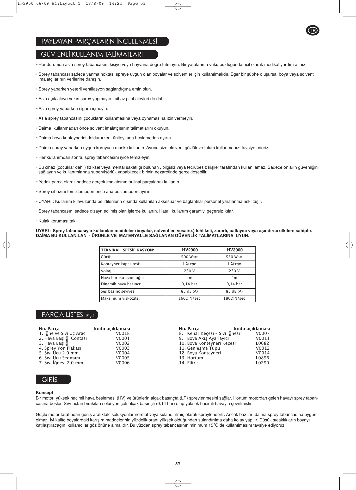 + Her durumda asla sprey tabancasini kisiye veya hayvana doÿru tutmayin. Bir yaralanma vuku bulduÿgunda acil olarak medikal yardim aliniz. + Sprey tabancasi sadece yanma noktasi spreye uygun olan boyalar ve solventier için kullaimalidir. Eder bir süphe olusursa, boya veya solvent imalatgilarinin verilerine danisin. + Sprey yaparken yeterli ventilasyon saÿlandigina emin olun. - Asla açik aleve yakin sprey yapmayin , cihaz pilot alevieri de dahil. + Asla sprey yaparken sigara iemeyin. + Asla sprey tabancasini çocuklarin kullanmasina veya oynamasina izin vermeyin. + Daima kullanmadan ônce solvent imalatgisinin talimatlarini okuyun: + Daima boya konteynerini doldururken üniteyi ana beslemeden ayirin. + Daima sprey yaparken uygun koruyucu maske kullanin. Ayrica size eldiven, gôzlük ve tulum kullanmanizi tavsiye ederiz. + Her kullanimdan sonra, sprey tabancasini iyice temizleyin. + Bu cihaz (çocuklar dahil) fiziksel veya mental sakathÿi bulunan , bilgisiz veya tecrübesiz Kisiler tarafndan kullanilamaz. Sadece onlann güvenligini saëlayan ve kullanmlarina supervisériük yapabilecek birinin nezaretinde gerçeklesebili. + Yedek parça olarak sadece gerçek imalatginin orijinal parçalarini Kullanin. + Sprey cihazini temizlemeden ônce ana beslemeden ayirin. + UYARI : Kullanim kilavuzunda belirilenlerin disinda kullanilan aksesuar ve baÿlantilar personel yaralanma riski tasir. + Sprey tabancasini sadece dizayn edilmis olan islerde kullanin. Hatali Kullanim garantiyi geçersiz kilar.