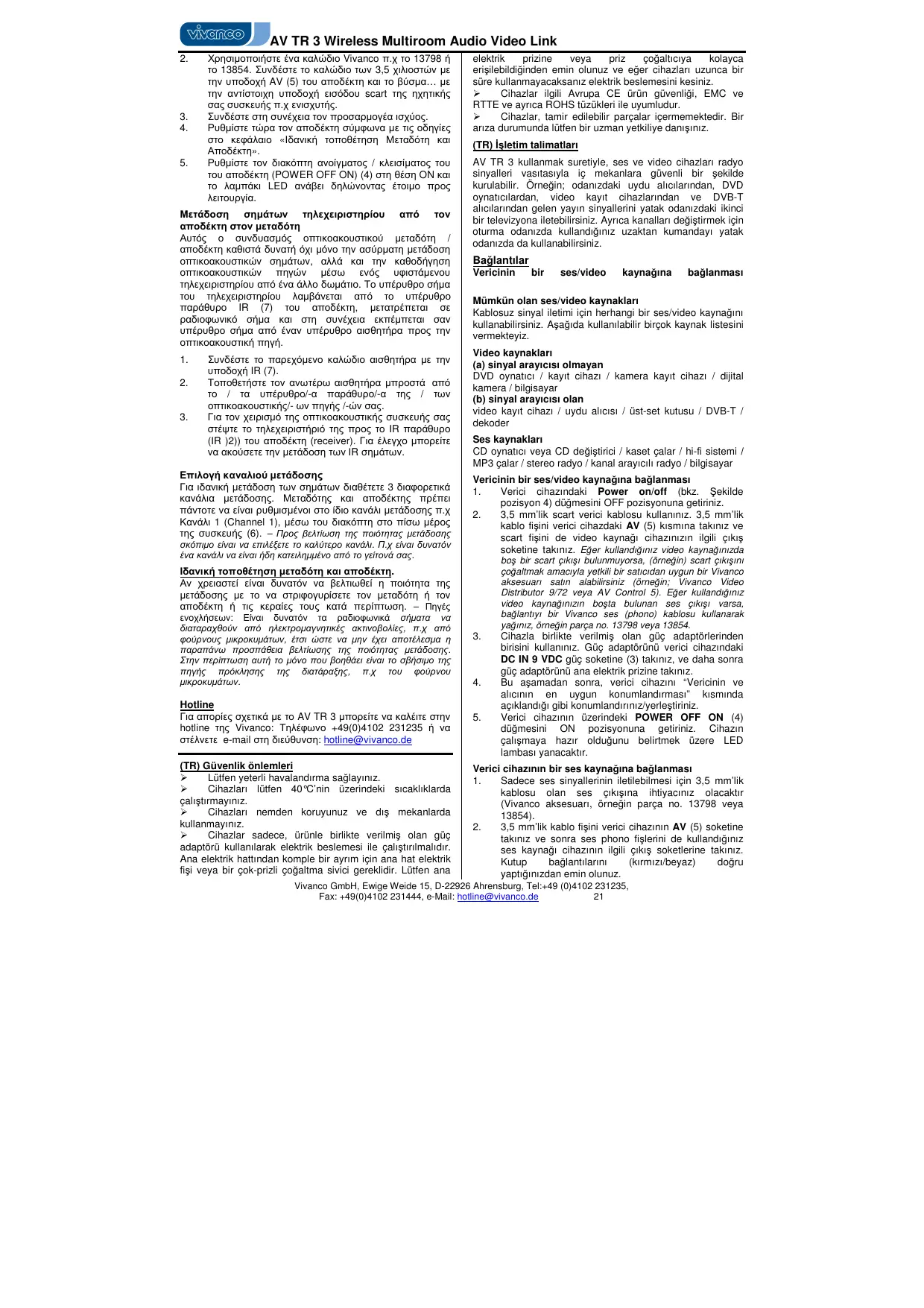 AV TR 3 WIRELESS MULTIROOM AUDIO VIDEO LINK - Kablosuz çok odalı ses/görüntü sistemi VIVANCO - Notice d'utilisation et mode d'emploi gratuit