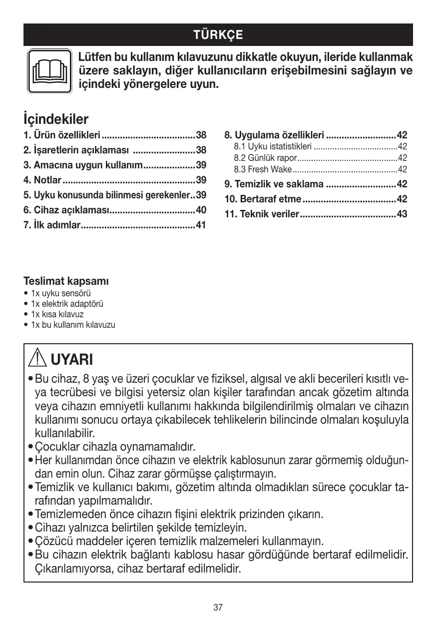 İçindekiler 1. Ürün özellikleri38 2. İşaretlerin açıklaması 38 3. Amacına uygun kullanım39 4. Notlar39 5. Uyku konusunda bilinmesi gerekenler...39 6. Cihaz açıklaması40 7. İlk adımlar41