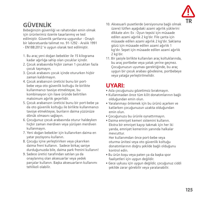 GÜVENLİK Bebeğinizin güvenliği ve rahatından emin olmak için ürünlerimiz özenle tasarlanmış ve test edilmiştir. Güvenlik şartlarına uygundur - Onaylı bir laboratuarda talimat no. 91-1292 - Aralık 1991 - EN188:2012 ‘e uygun olarak test edilmiştir. 1. Bu araç yeni doğan bebekler ile 15 kilograma kadar ağırlığa sahip olan çocuklar içindir. 2. Çocuk arabasında hiçbir zaman 1 çocuktan fazla çocuk taşımayın. 3. Çocuk arabasını çocuk içinde otururken hiçbir zaman kaldırmayın. 4. Çocuk arabanızın üreticisi bunu bir portbebe veya oto güvenlik koltuğu ile birlikte kullanmanızı tavsiye etmekteyse, bu kombinasyon için ilave üründe belirtilen maksimum ağırlık geçerlidir. 5. Çocuk arabanızın üreticisi bunu bir port-bebe ya da oto güvenlik koltuğu ile birlikte kullanmanızı tavsiye etmekteyse, bunların daima yüzünüze dönük olmasını sağlayın. 6. Çocuğunuz çocuk arabasında oturur haldeyken hiçbir zaman merdiven veya yürüyen merdiven kullanmayın. 7. Yeni doğan bebekler için kullanırken daima en yatar pozisyonu kullanın. 8. Çocuğu içine yerleştirirken veya çıkarırken daima freni kullanın. Sadece birkaç saniye durduğunuzda bile, daima park frenini kullanın! 9. Sadece üretici tarafından satılan ya da onaylanmış olan aksesuarlar veya yedek parçalar kullanın. Başka aksesuarların kullanımı tehlikeli olabilir.