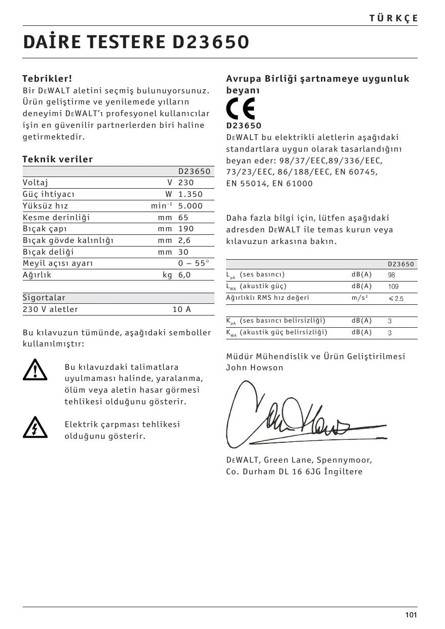 Avrupa Birliği şartnameye uygunluk beyan D23650 D E WALT bu elektrikli aletlerin aşağdaki standartlara uygun olarak tasarlandğn beyan eder: 98/37/EEC,89/336/EEC, 73/23/EEC, 86/188/EEC, EN 60745, EN 55014, EN 61000 Daha fazla bilgi için, lütfen aşağdaki adresden D E WALT ile temas kurun veya klavuzun arkasna bakn. D23650 L pA (ses basnc) dB(A) L WA (akustik güç) dB(A) Ağrlkl RMS hz değeri m/s 2 K pA (ses basnc belirsizliği) dB(A) K WA (akustik güç belirsizliği) dB(A) 10 A Bu klavuzun tümünde, aşağdaki semboller kullanlmştr: Bu klavuzdaki talimatlara uyulmamas halinde, yaralanma, ölüm veya aletin hasar görmesi tehlikesi olduğunu gösterir. Müdür Mühendislik ve Ürün Geliştirilmesi John Howson Elektrik çarpmas tehlikesi olduğunu gösterir. D E WALT, Green Lane, Spennymoor, Co. Durham DL 16 6JG İngiltere