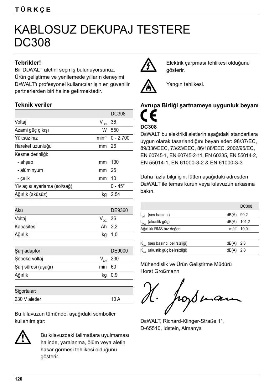 DC308 DEWALT bu elektrikli aletlerin aşağıdaki standartlara uygun olarak tasarlandığını beyan eder: 98/37/EC, 89/336/EEC, 73/23/EEC, 86/188/EEC, 2002/95/EC, EN 60745-1, EN 60745-2-11, EN 60335, EN 55014-2, EN 55014-1, EN 61000-3-2 & EN 61000-3-3 Daha fazla bilgi için, lütfen aşağıdaki adresden DEWALT ile temas kurun veya kılavuzun arkasına bakın. DC308 LpA (ses basıncı) dB(A) 90,2 LWA (akustik güç) dB(A) 101,2 Ağırlıklı RMS hız değeri KpA (ses basıncı belirsizliği) dB(A) 2,8 KWA (akustik güç belirsizliği) dB(A) 2,8 Mühendislik ve Ürün Geliştirme Müdürü Horst Großmann Sigortalar: 230 V aletler 10 A Bu kılavuzun tümünde, aşağıdaki semboller kullanılmıştır: