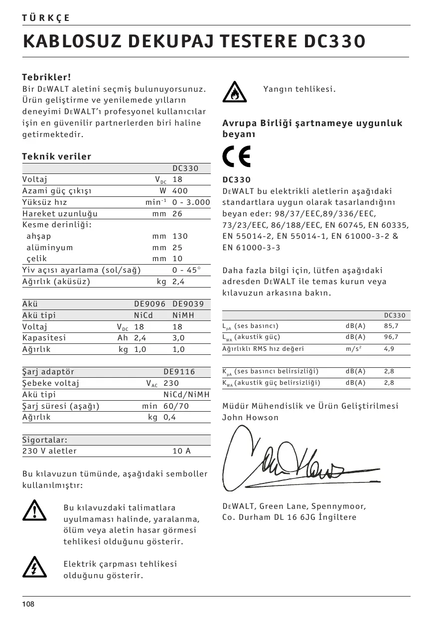 Tebrikler! Bir D E WALT aletini seçmiş bulunuyorsunuz. Ürün geliştirme ve yenilemede yllarn deneyimi D E WALT’ profesyonel kullanclar işin en güvenilir partnerlerden biri haline getirmektedir. Yangn tehlikesi. Avrupa Birliği şartnameye uygunluk beyan) Teknik veriler DC330