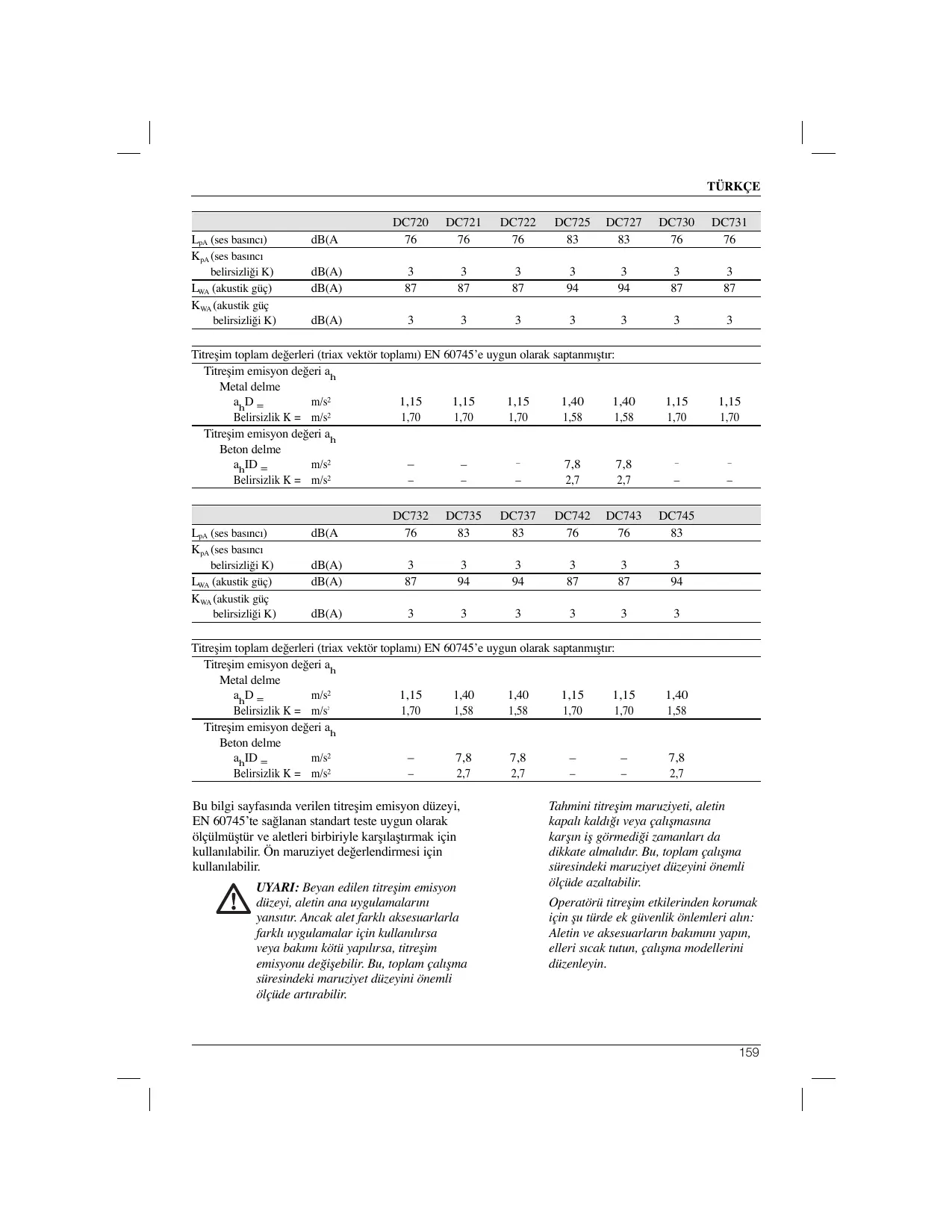Titreşim toplam değerleri (triax vektör toplamı) EN 60745’e uygun olarak saptanmıştır: Titreşim emisyon değeri ah Metal delme ahD = m/s² 1,15 1,40 1,40 1,15 1,15 Belirsizlik K = m/s² 1,70 1,58 1,58 1,70 1,70 Titreşim emisyon değeri ah Beton delme ahID = m/s² 7,8 7,8