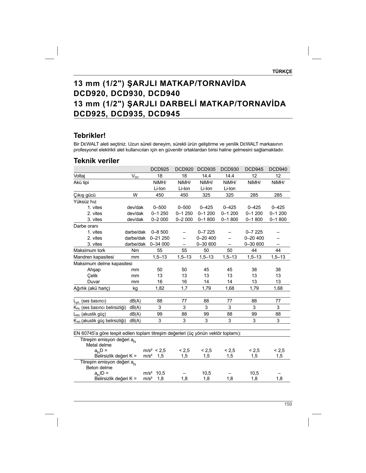 Tebrikler! Bir DEWALT aleti seçtiniz. Uzun süreli deneyim, sürekli ürün gelistirme ve yenilik DEWALT markasinin profesyonel elektrikli alet kullanicilart için en güvenilir ortaklardan birisi haline gelmesini saÿlamaktadir. Teknik veriler