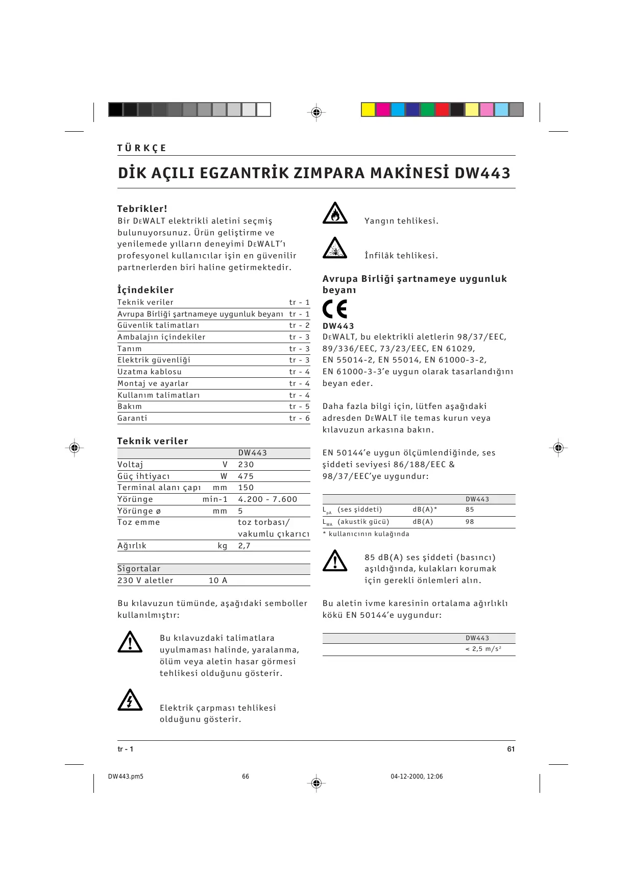 DK AÇILI EGZANTRIK ZIMPARA MAKÏNESÏ DW443 Tebrikler! Bir DEWALT elektrikli aletini seçmis bulunuyorsunuz. Ürün gelistirme ve yenilemede yillarin deneyimi DeWALTA profesyonel kullamictlar isin en güvenilir partnerlerden biri haline getirmektedir. içindekiler Teknik veriler tr-1 Avrupa Birligi sartnameye uygunluk beyam tr - 1 Güventik talimatlan t-2 Ambalajin içindekiler tr-3 Tamm tr-3 Elektrik güventigi LE Uzatma kablosu tr-4 Montaj ve ayarlar tr-4 Kullanim talimatlanr tr-4 Bakim W5 Garanti tr-6 Teknik veriler À Yangin tehlikesi. infiläk tehlikesi. Avrupa Birligi sartnameye uygunluk beyan