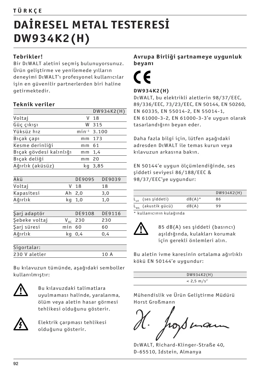Bu kilavuzdaki talimatlara uyulmamasi halinde, yaralanma, ôlüm veya aletin hasar gôrmesi tehlikesi oldugunu gôsterir. Elektrik çarpmasi tehlikesi olduÿunu gôsterir. këkü EN 50144'e uygundur: DW934K2(H) <2,5 m/s Mühendislik ve Ürün Gelistirme Müdürü Horst Gro8mann À Jap DEWALT, Richard-Klinger-StraBe 40, D-65510, Idstein, Almanya