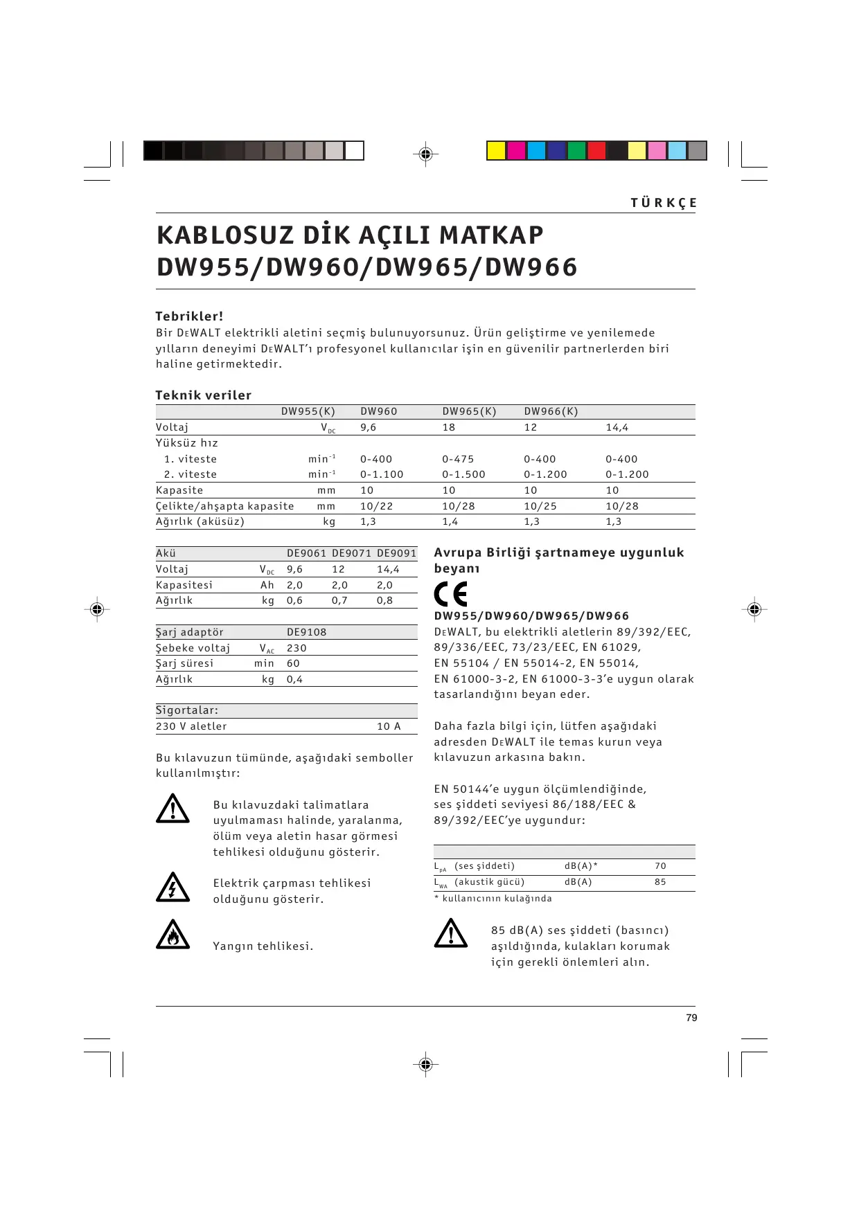 CONS DOM || Bu aletin ivme karesinin ortalama aÿirliklr kôkü EN 50144'e uygundur: <25 m/s Mühendislik ve Ürün Gelistirme Müdürü Horst Gro8mann À pra DEWALT, Richard-Klinger-StraBe 40, D-65510, Idstein, Almanya Güvenlik talimatlar: Elektrikli aletleri kullanirken daima, yangin, elektrik çarpmast ve yaralanma riskini azaltmak için, ülkenizde uygulanabilecek güventik kurallarina uyun. Bu ürünü kullanma girisiminde bulunmadan ônce, açaÿidaki güventik talimatlarnm dikkatle okuyun. Bu talimatlan güvenli bir yerde saklayin. Genel Bilgiler 1 Çahiÿma alammia temiz tutun Daëinik yerler ve tezgahlar kazaya neden olabilir.