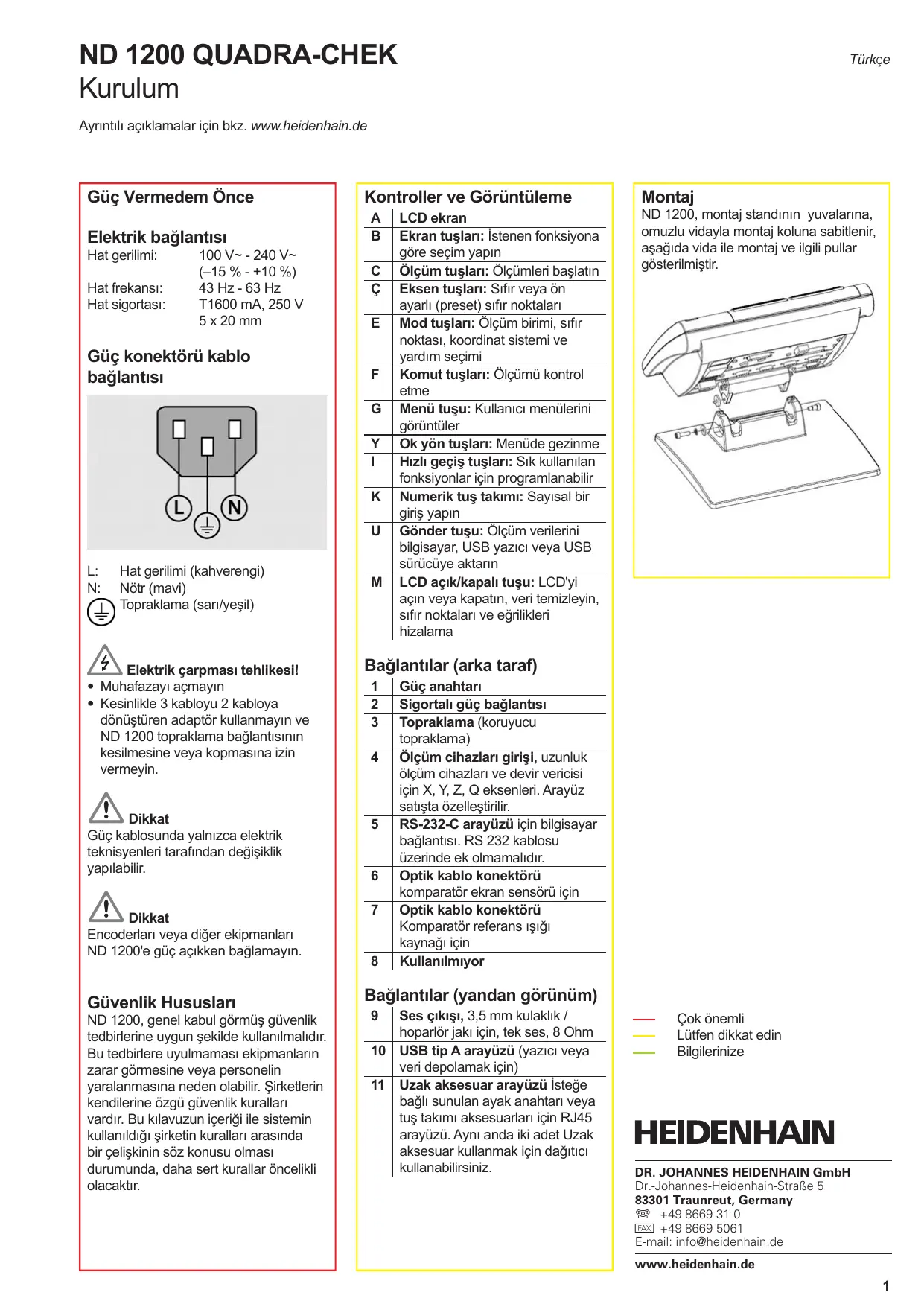 ND 1200 QUADRA-CHEK Kurulum Türkçe Ayrõntõlõ açõklamalar için bkz. www.heidenhain.de Güç Vermedem Önce Elektrik bağlantõsõ Hat gerilimi: Hat frekansõ: Hat sigortasõ: 100 V~ - 240 V~ (–15 % - +10 %) 43 Hz - 63 Hz T1600 mA, 250 V 5 x 20 mm Güç konektörü kablo bağlantõsõ Kontroller ve Görüntüleme