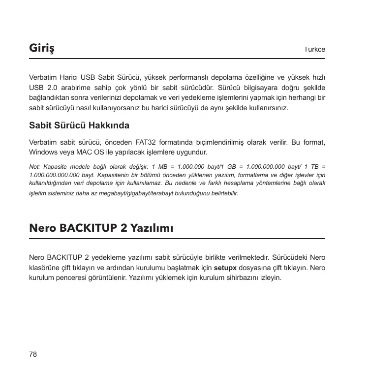 Verbatim sabit sürücü, ônceden FAT32 formatinda bigimlendirimis olarak verilir. Bu format, Windows veya MAC OS ile yapilacak islemlere uygundur. Not Kapasite modele bagli olarak degisir. 1 MB = 1.000.000 bay/1 GB = 1.000.000.000 bay 1 TB =