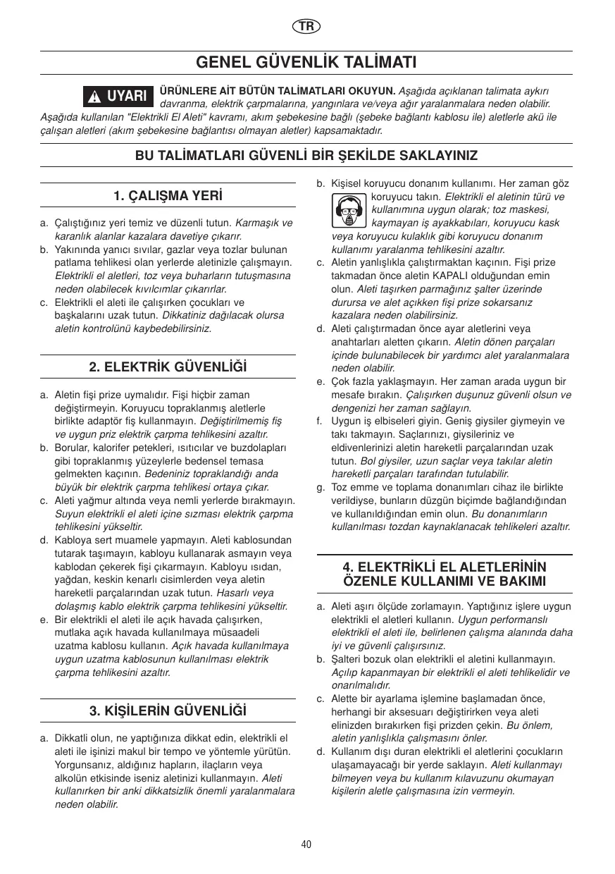 TR GENEL GÜVENL∑K TAL∑MATI ÜRÜNLERE A∑T BÜTÜN TAL∑MATLARI OKUYUN. Aμaπ∂da aç∂klanan talimata ayk∂r∂ davranma, elektrik çarpmalar∂na, yang∂nlara ve/veya aπ∂r yaralanmalara neden olabilir. Aμaπ∂da kullan∂lan "Elektrikli El Aleti" kavram∂, ak∂m μebekesine baπl∂ (μebeke baπlant∂ kablosu ile) aletlerle akü ile çal∂μan aletleri (ak∂m μebekesine baπlant∂s∂ olmayan aletler) kapsamaktad∂r.