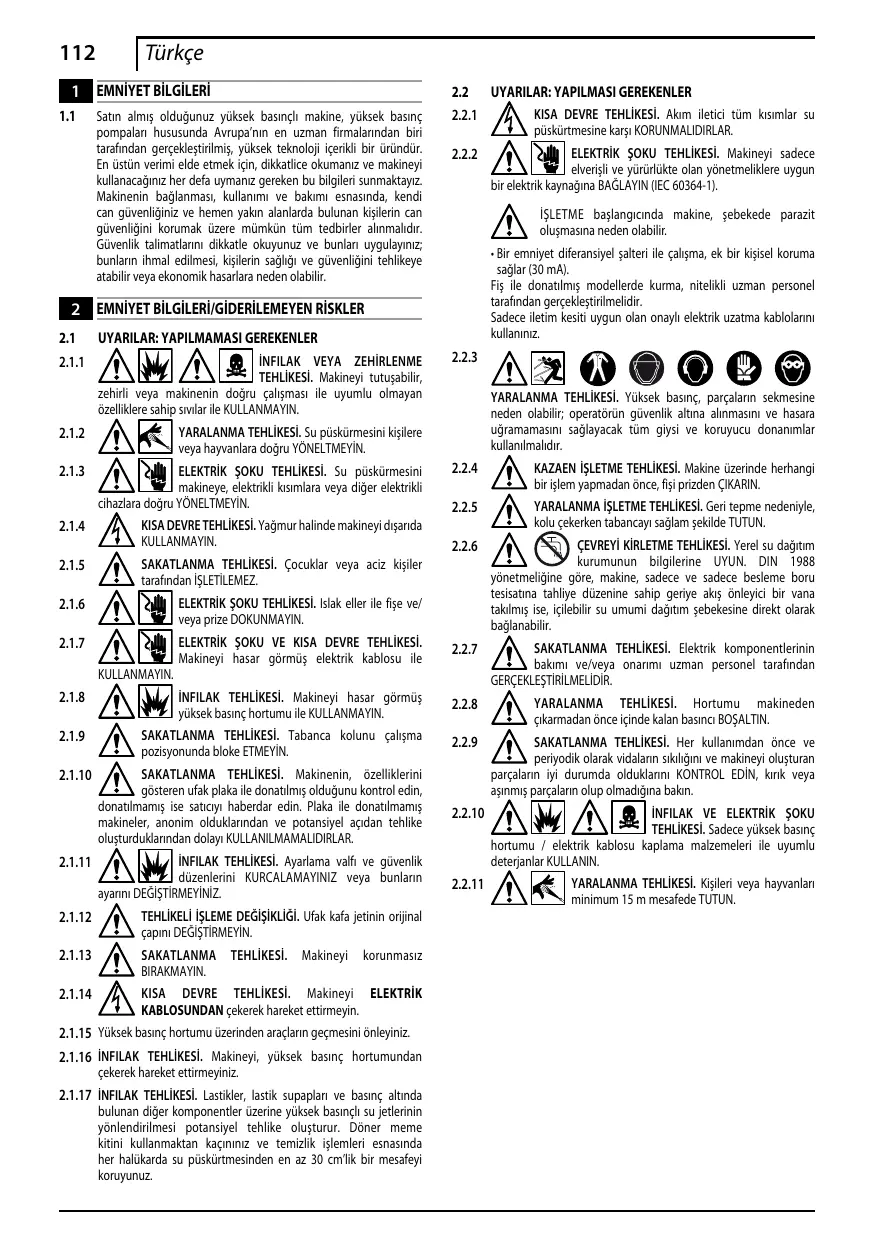 2.1.15 Yüksek basınç hortumu üzerinden araçların geçmesini önleyiniz. 2.1.16 İnfilak TEHLİKESİ. Makineyi, yüksek basınç hortumundan çekerek hareket ettirmeyiniz.