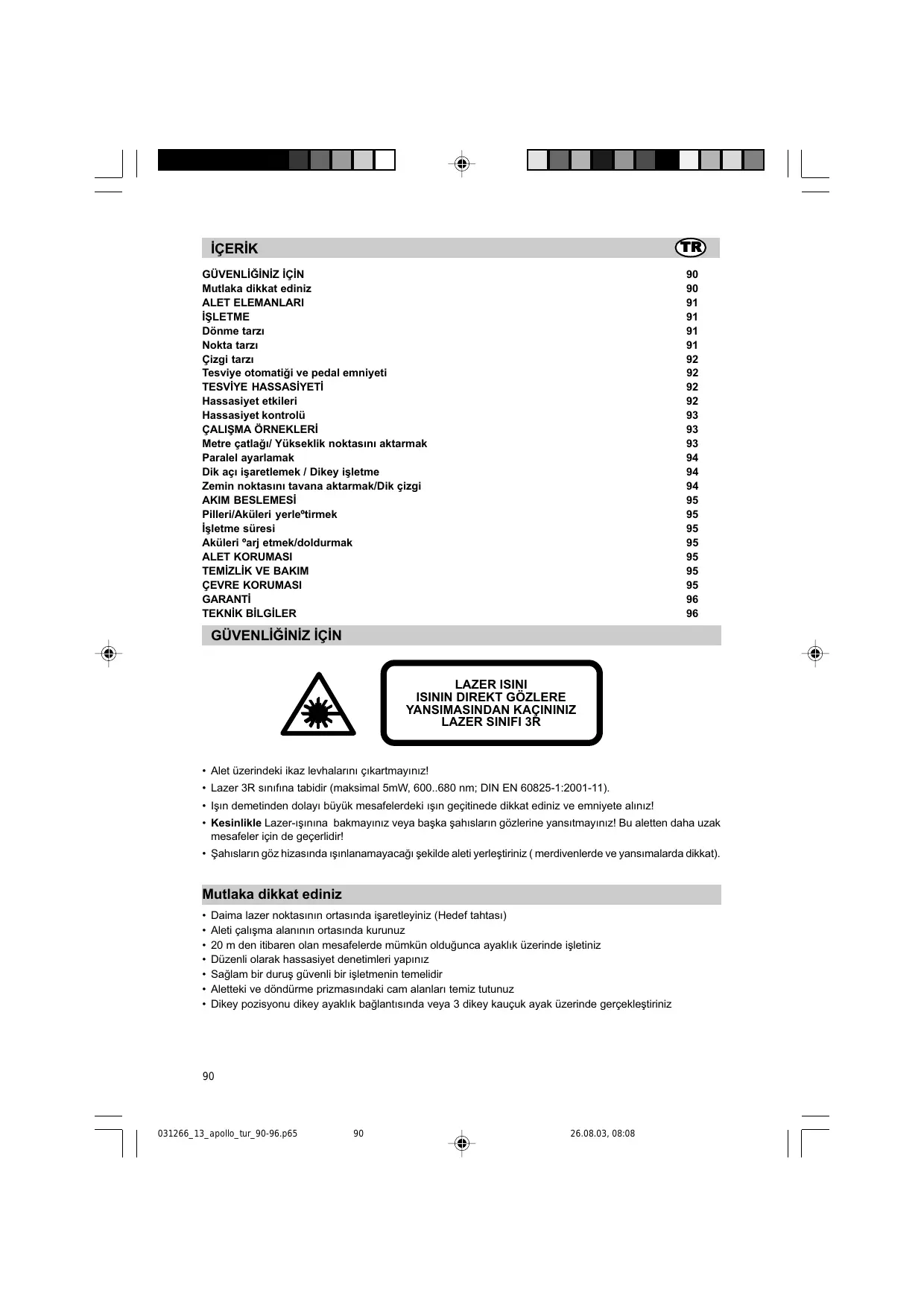 + Alet üzerindeki ikaz levhalarnt gikartmayinuz! + Lazer 3R sinifina tabidir (maksimal 5mW, 600.680 nm; DIN EN 60825-1:2001-11). + Igin demetinden dolay1 büyük mesafelerdeki 1sin gegitinede dikkat ediniz ve emniyete aliniz! + Kesinlikle Lazeraginina bakmayinez veya bagka sahislarin gôzlerine yansitmayiniz! Bu aletten daha uzak mesafeler igin de geçerlidir! + Sahislarin gôz hizasinda isinlanamayacaÿi sekilde aleti yerlestiriniz ( merdiventerde ve yansimalarda dikkat). Mutlaka dikkat ediniz + Daima lazer noktasinin ortasinda isaretleyiniz (Hedef tahtasi) + Aleti çaligma alaninin ortasinda kurunuz + 20 m den itibaren olan mesafelerde mümkün oldugunca ayaklk üzerinde isletiniz + Düzenli olarak hassasiyet denetimleri yapiniz + Saÿlam bir durus güvenli bir isletmenin temelidir + Aletteki ve dëndürme prizmasindaki cam alanlan temiz tutunuz + Dikey pozisyonu dikey ayaklik baglantisinda veya 3 dikey kauçuk ayak üzerinde gerçeklegtiriniz