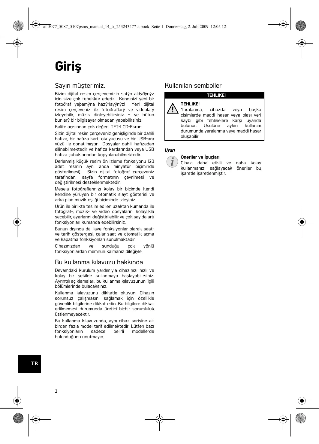 af-5077_5087_5107psms_manual_14_tr_253243477-a.book Seite 1 Donnerstag, 2. Juli 2009 12:05 12 Giriş Sayın müşterimiz, Bizim dijital resim çerçevemizin satýn aldýðýnýz için size çok teþekkür ederiz. Kendinizi yeni bir fotoðraf yaþamýna hazýrlayýnýz! Yeni dijital resim çerçeveniz ile fotoðraflarý ve videolarý izleyebilir, müzik dinleyebilirsiniz – ve bütün bunlarý bir bilgisayar olmadan yapabilirsiniz. Kullanılan semboller Tehlike Uyarısı TEHLIKE! TEHLIKE! Yaralanma, cihazda veya başka cisimlerde maddi hasar veya olası veri kaybı gibi tehlikelere karşı uyarıda bulunur. Usulüne aykırı kullanım durumunda yaralanma veya maddi hasar oluşabilir. Kalite açısından çok değerli TFT-LCD-Ekran Belleği Sizin dijital resim çerçeveniz genişliğinde bir dahili hafıza, bir hafıza kartı okuyucusu ve bir USB-ara yüzü ile donatılmıştır. Dosyalar dahili hafızadan silinebilmektedir ve hafıza kartlarından veya USB hafıza çubuklarından kopyalanabilmektedir. Derlenmiş küçük resim ön izleme fonksiyonu (20 adet resmin aynı anda minyatür biçiminde gösterilmesi). Sizin dijital fotoğraf çerçeveniz tarafından, sayfa formatının çevrilmesi ve değiştirilmesi desteklenmektedir. Mesela fotoğraflarınızı kolay bir biçimde kendi kendine yürüyen bir otomatik slayt gösterisi ve arka plan müzik eşliği biçiminde izleyiniz. Ürün ile birlikte teslim edilen uzaktan kumanda ile fotoğraf-, müzik- ve video dosyalarını kolaylıkla seçebilir, ayarlarını değiştirilebilir ve çok sayıda artı fonksiyonları kumanda edebilirsiniz. Bunun dışında da ilave fonksiyonlar olarak saatve tarih göstergesi, çalar saat ve otomatik açma ve kapatma fonksiyonları sunulmaktadır. Cihazınızdan sunduğu çok yönlü fonksiyonlardan memnun kalmanız dileğiyle. Bu kullanma kılavuzu hakkında Devamdaki kurulum yardımıyla cihazınızı hızlı ve kolay bir şekilde kullanmaya başlayabilirsiniz. Ayrıntılı açıklamaları, bu kullanma kılavuzunun ilgili bölümlerinde bulacaksınız. Kullanma kılavuzunu dikkatle okuyun. Cihazın sorunsuz çalışmasını sağlamak için özellikle güvenlik bilgilerine dikkat edin. Bu bilgilere dikkat edilmemesi durumunda üretici hiçbir sorumluluk üstlenmeyecektir. Bu kullanma kılavuzunda, aynı cihaz serisine ait birden fazla model tarif edilmektedir. Lütfen bazı fonksiyonların sadece belirli modellerde bulunduğunu unutmayın.