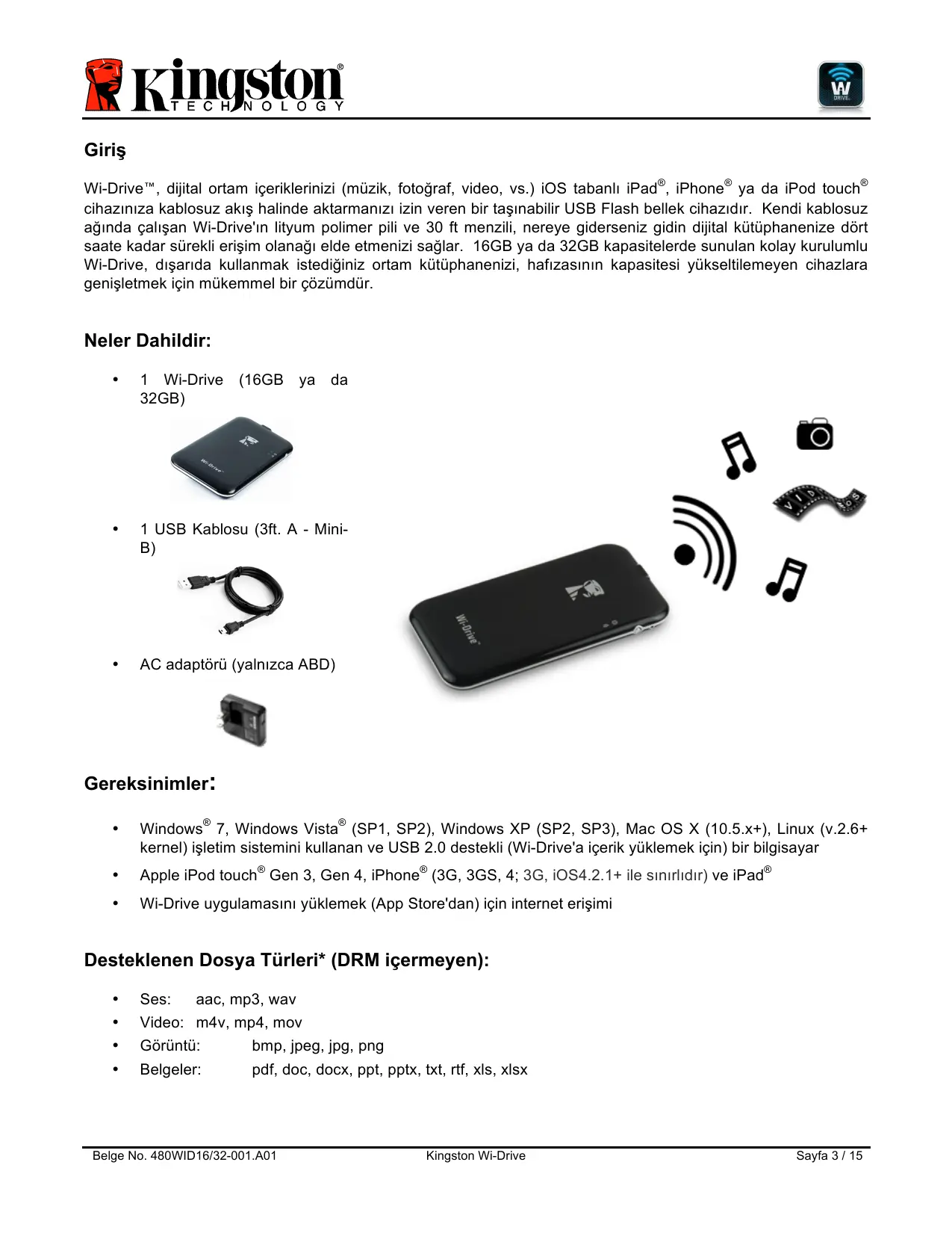 CONNEXION SANS FIL DE WI-DRIVE 9 UTILISATION 9 16 ou 32 Go et une configuration simple, Wi-Drive est la solution parfaite pour élargir votre bibliothèque média portable avec des supports dont la capacité de stockage est inexpansible.