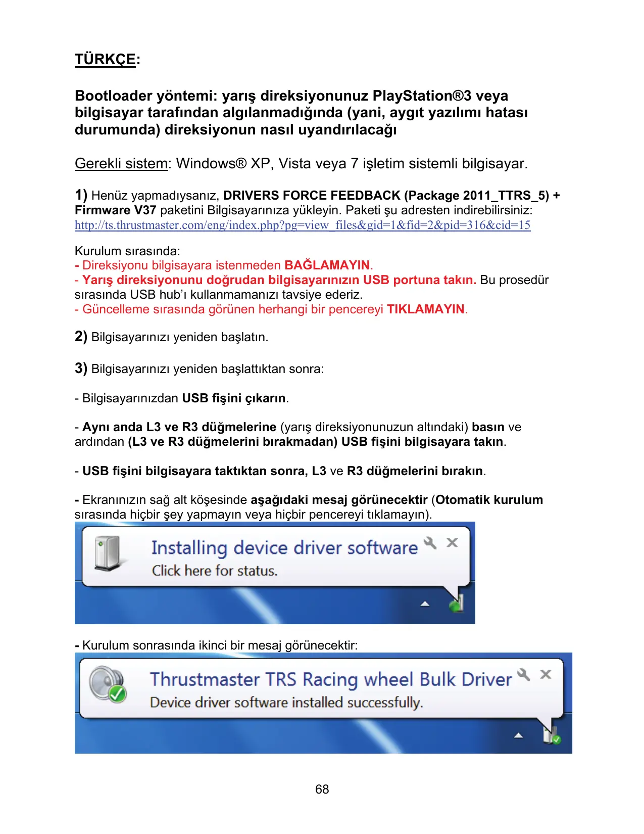 TÜRKÇE: Bootloader yöntemi: yarış direksiyonunuz PlayStation®3 veya bilgisayar tarafından algılanmadığında (yani, aygıt yazılımı hatası durumunda) direksiyonun nasıl uyandırılacağı Gerekli sistem: Windows® XP, Vista veya 7 işletim sistemli bilgisayar.