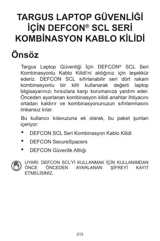 Ventanas de combinación DEFCON SCL 2 La combinación preajustada aparece en una pegatina que está pegada a la parte posterior de este manual. NOTA: ALTERNATIVAMENTE, PUEDE TOMAR NOTA DE LA COMBINACIÓN EN OTRO LOGAR SEGURO Y FÁCIL DE ENCONTRAR, MANTENIÉNDOLA LEJOS DEL PORTÁTIL. 3 Gire los discos para esconder la combinación.
