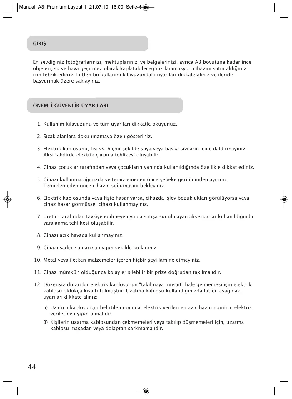Manual_A3_Premium:Layout 1 21.07.10 16:00 Seite 44 GİRİŞ En sevdiğiniz fotoğraflarınızı, mektuplarınızı ve belgelerinizi, ayrıca A3 boyutuna kadar ince objeleri, su ve hava geçirmez olarak kaplatabileceğiniz laminasyon cihazını satın aldığınız için tebrik ederiz. Lütfen bu kullanım kılavuzundaki uyarıları dikkate alınız ve ileride başvurmak üzere saklayınız.