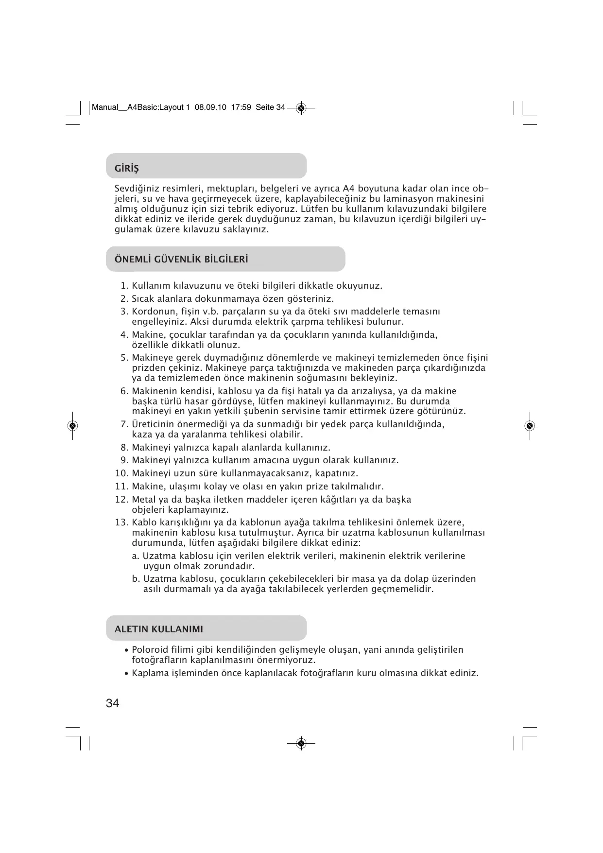 Manual__A4Basic:Layout 1 08.09.10 17:59 Seite 34 GİRİŞ Sevdiğiniz resimleri, mektupları, belgeleri ve ayrıca A4 boyutuna kadar olan ince objeleri, su ve hava geçirmeyecek üzere, kaplayabileceğiniz bu laminasyon makinesini almış olduğunuz için sizi tebrik ediyoruz. Lütfen bu kullanım kılavuzundaki bilgilere dikkat ediniz ve ileride gerek duyduğunuz zaman, bu kılavuzun içerdiği bilgileri uygulamak üzere kılavuzu saklayınız. ÖNEMLİ GÜVENLİK BİLGİLERİ