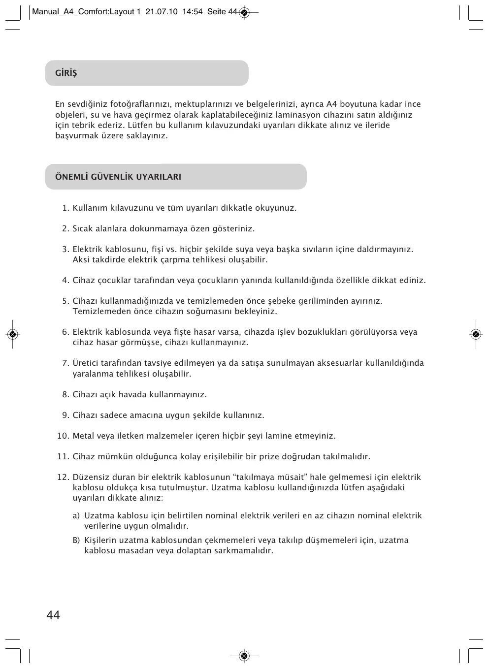 Manual_A4_Comfort:Layout 1 21.07.10 14:54 Seite 44 GİRİŞ En sevdiğiniz fotoğraflarınızı, mektuplarınızı ve belgelerinizi, ayrıca A4 boyutuna kadar ince objeleri, su ve hava geçirmez olarak kaplatabileceğiniz laminasyon cihazını satın aldığınız için tebrik ederiz. Lütfen bu kullanım kılavuzundaki uyarıları dikkate alınız ve ileride başvurmak üzere saklayınız.
