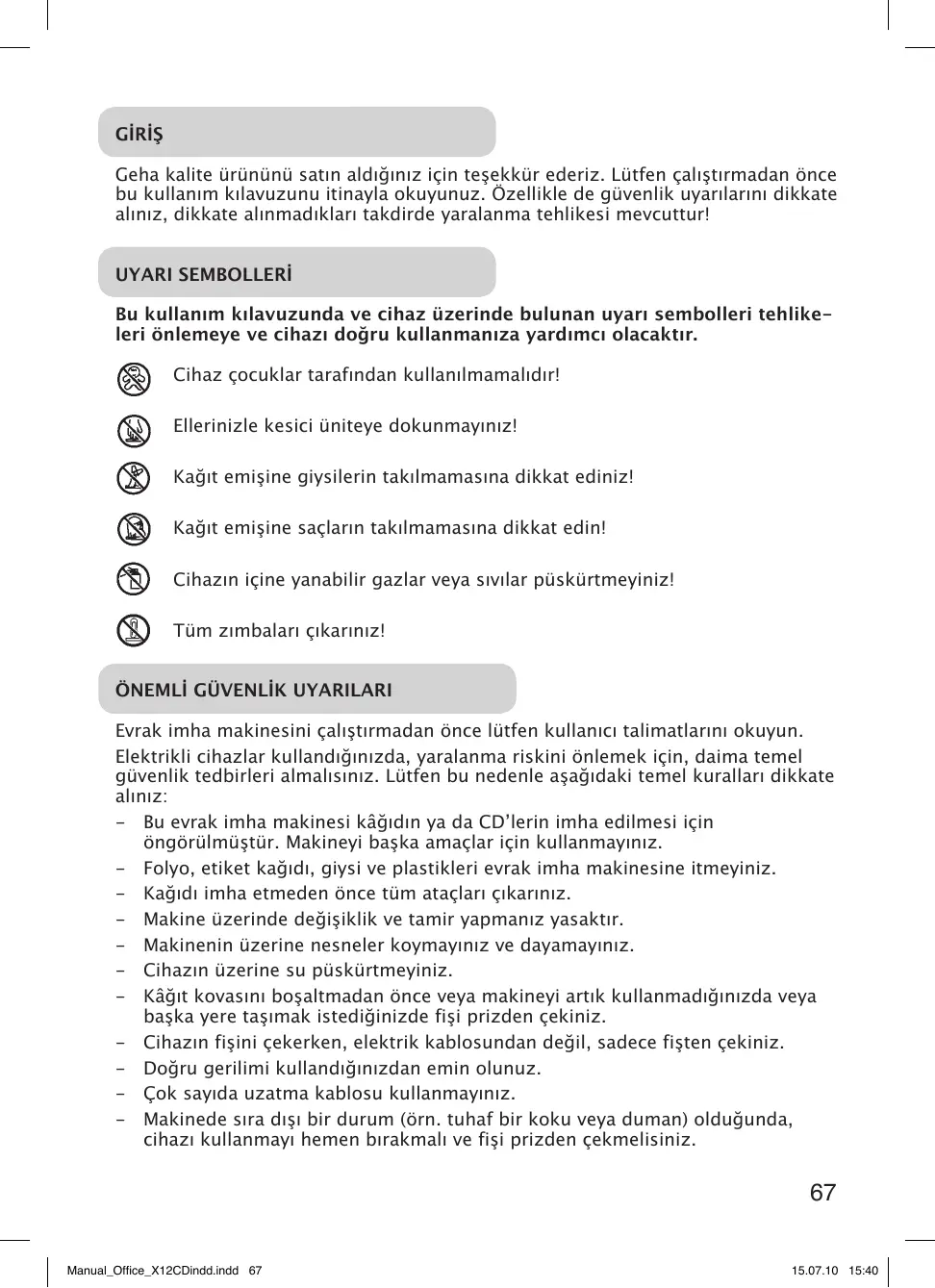 Tüm zımbaları çıkarınız! Önemli güvenlik uyarıları Evrak imha makinesini çalıştırmadan önce lütfen kullanıcı talimatlarını okuyun. Elektrikli cihazlar kullandığınızda, yaralanma riskini önlemek için, daima temel güvenlik tedbirleri almalısınız. Lütfen bu nedenle aşağıdaki temel kuralları dikkate alınız: - Bu evrak imha makinesi kâğıdın ya da CD’lerin imha edilmesi için öngörülmüştür. Makineyi başka amaçlar için kullanmayınız. - Folyo, etiket kağıdı, giysi ve plastikleri evrak imha makinesine itmeyiniz. - Kağıdı imha etmeden önce tüm ataçları çıkarınız. - Makine üzerinde değişiklik ve tamir yapmanız yasaktır. - Makinenin üzerine nesneler koymayınız ve dayamayınız. - Cihazın üzerine su püskürtmeyiniz. - Kâğıt kovasını boşaltmadan önce veya makineyi artık kullanmadığınızda veya başka yere taşımak istediğinizde fişi prizden çekiniz. - Cihazın fişini çekerken, elektrik kablosundan değil, sadece fişten çekiniz. - Doğru gerilimi kullandığınızdan emin olunuz. - Çok sayıda uzatma kablosu kullanmayınız. - Makinede sıra dışı bir durum (örn. tuhaf bir koku veya duman) olduğunda, cihazı kullanmayı hemen bırakmalı ve fişi prizden çekmelisiniz.