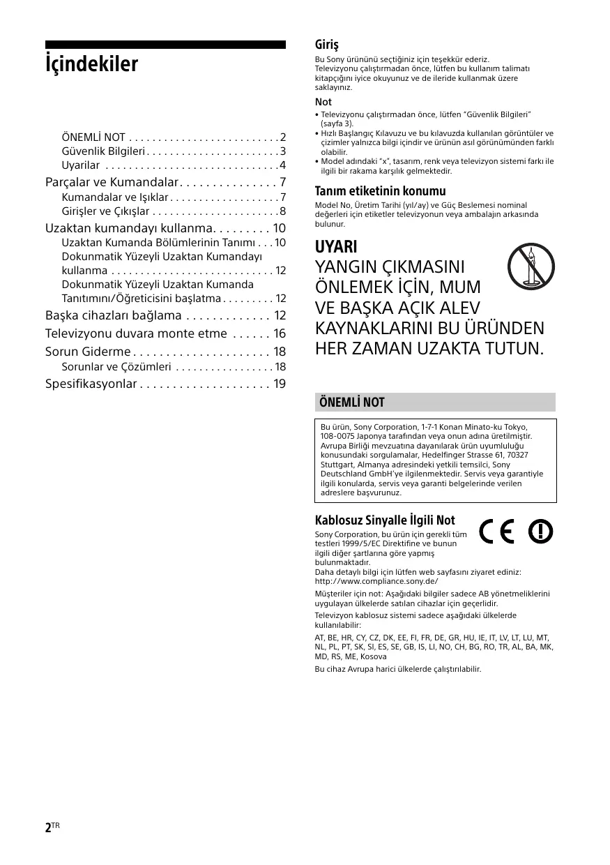 HER ZAMAN UZAKTA TUTUN. Sorunlar ve Çözümleri . . . . . . . . . . . . . . . . . 18 Spesifikasyonlar . . . . . . . . . . . . . . . . . . . . 19 ÖNEMLİ NOT Bu ürün, Sony Corporation, 1-7-1 Konan Minato-ku Tokyo, 108-0075 Japonya tarafından veya onun adına üretilmiştir. Avrupa Birliği mevzuatına dayanılarak ürün uyumluluğu konusundaki sorgulamalar, Hedelfinger Strasse 61, 70327 Stuttgart, Almanya adresindeki yetkili temsilci, Sony Deutschland GmbH’ye ilgilenmektedir. Servis veya garantiyle ilgili konularda, servis veya garanti belgelerinde verilen adreslere başvurunuz. Kablosuz Sinyalle İlgili Not Sony Corporation, bu ürün için gerekli tüm testleri 1999/5/EC Direktifine ve bunun ilgili diğer şartlarına göre yapmış bulunmaktadır. Daha detaylı bilgi için lütfen web sayfasını ziyaret ediniz: http://www.compliance.sony.de/ Müşteriler için not: Aşağıdaki bilgiler sadece AB yönetmeliklerini uygulayan ülkelerde satılan cihazlar için geçerlidir. Televizyon kablosuz sistemi sadece aşağıdaki ülkelerde kullanılabilir: AT, BE, HR, CY, CZ, DK, EE, FI, FR, DE, GR, HU, IE, IT, LV, LT, LU, MT, NL, PL, PT, SK, SI, ES, SE, GB, IS, LI, NO, CH, BG, RO, TR, AL, BA, MK, MD, RS, ME, Kosova Bu cihaz Avrupa harici ülkelerde çalıştırılabilir. 2TR Havalandırma Güvenlik Bilgileri UYARI Piller güneş ışığı, ateş ve benzeri aşırı ısı kaynaklarına maruz bırakılmamalıdır. Montaj/Kurulum