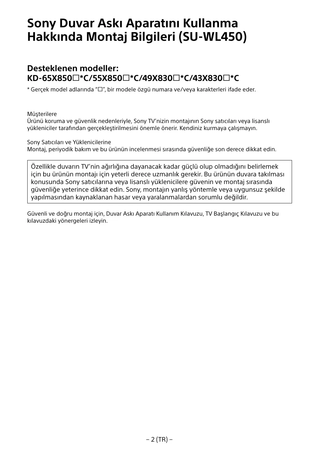 A l’attention des installateurs et revendeurs Sony Soyez particulièrement attentif à la sécurité pendant l’installation, l’entretien périodique et l’examen du produit.