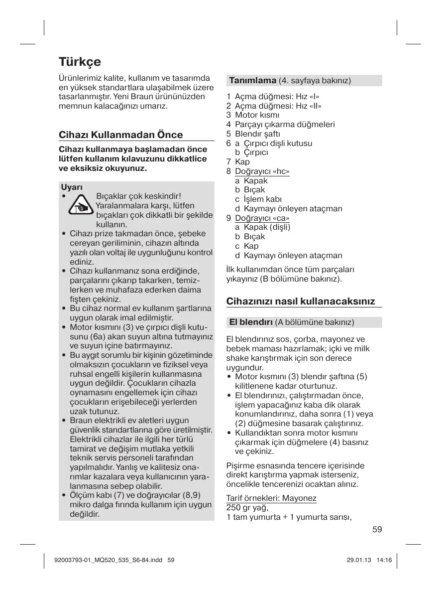 Bıçaklar çok keskindir! Yaralanmalara karşı, lütfen bıçakları çok dikkatli bir şekilde kullanın. Cihazı prize takmadan önce, şebeke cereyan geriliminin, cihazın altında yazılı olan voltaj ile uygunluğunu kontrol ediniz. Cihazı kullanmanız sona erdiğinde, parçalarını çıkarıp takarken, temizlerken ve muhafaza ederken daima fişten çekiniz. Bu cihaz normal ev kullanım şartlarına uygun olarak imal edilmiştir. Motor kısmını (3) ve çırpıcı dişli kutusunu (6a) akan suyun altına tutmayınız ve suyun içine batırmayınız. Bu aygıt sorumlu bir kişinin gözetiminde olmaksızın çocukların ve fiziksel veya ruhsal engelli kişilerin kullanmasına uygun değildir. Çocukların cihazla oynamasını engellemek için cihazı çocukların erişebileceği yerlerden uzak tutunuz. Braun elektrikli ev aletleri uygun güvenlik standartlarına göre üretilmiştir. Elektrikli cihazlar ile ilgili her türlü tamirat ve değişim mutlaka yetkili teknik servis personeli tarafından yapılmalıdır. Yanlış ve kalitesiz onarımlar kazalara veya kullanıcının yaralanmasına sebep olabilir. Ölçüm kabı (7) ve doğrayıcılar (8,9) mikro dalga fırında kullanım için uygun değildir.