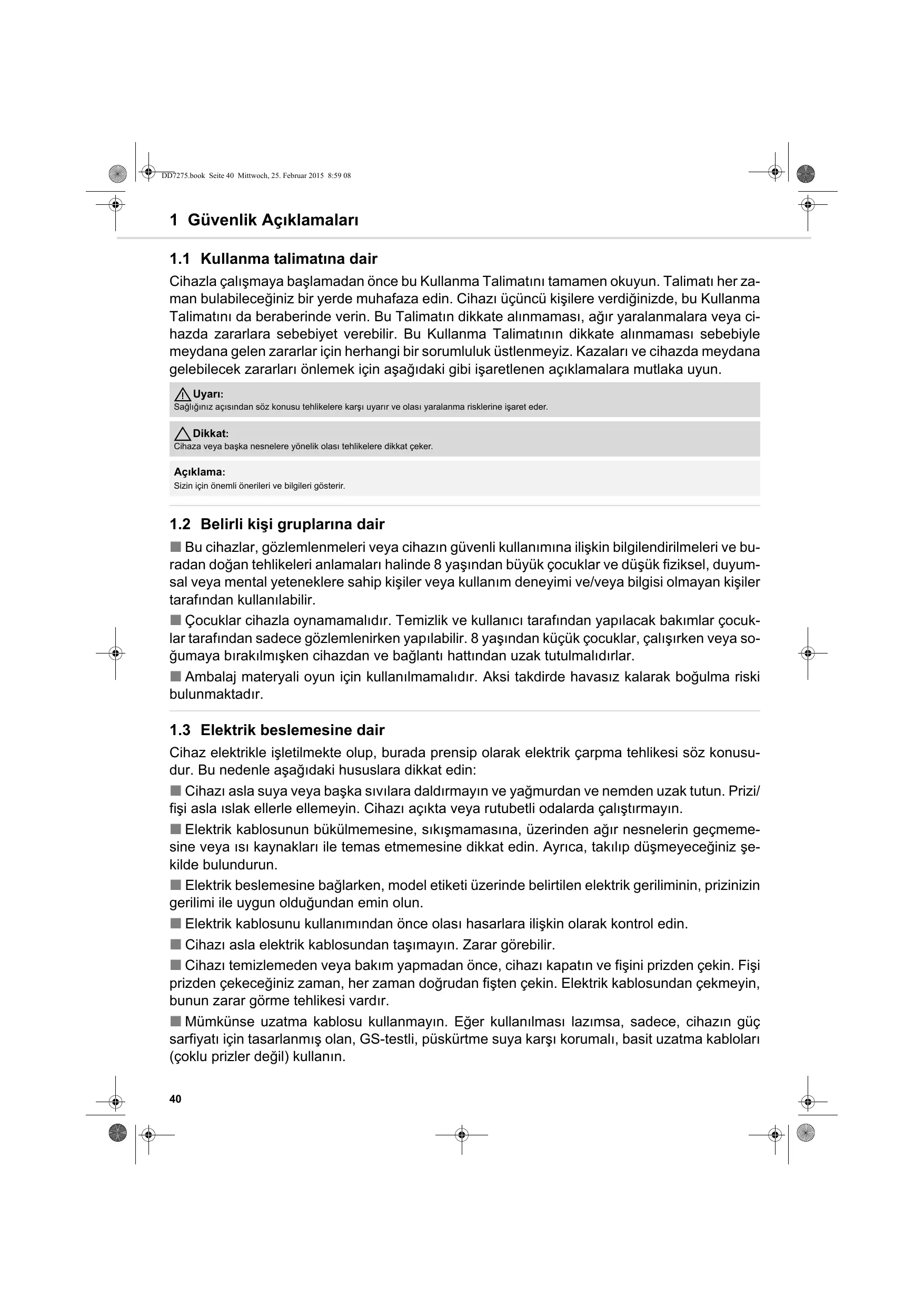 1.2 Belirli kişi gruplarına dair Bu cihazlar, gözlemlenmeleri veya cihazın güvenli kullanımına ilişkin bilgilendirilmeleri ve buradan doğan tehlikeleri anlamaları halinde 8 yaşından büyük çocuklar ve düşük fiziksel, duyumsal veya mental yeteneklere sahip kişiler veya kullanım deneyimi ve/veya bilgisi olmayan kişiler tarafından kullanılabilir. Çocuklar cihazla oynamamalıdır. Temizlik ve kullanıcı tarafından yapılacak bakımlar çocuklar tarafından sadece gözlemlenirken yapılabilir. 8 yaşından küçük çocuklar, çalışırken veya soğumaya bırakılmışken cihazdan ve bağlantı hattından uzak tutulmalıdırlar. Ambalaj materyali oyun için kullanılmamalıdır. Aksi takdirde havasız kalarak boğulma riski bulunmaktadır.