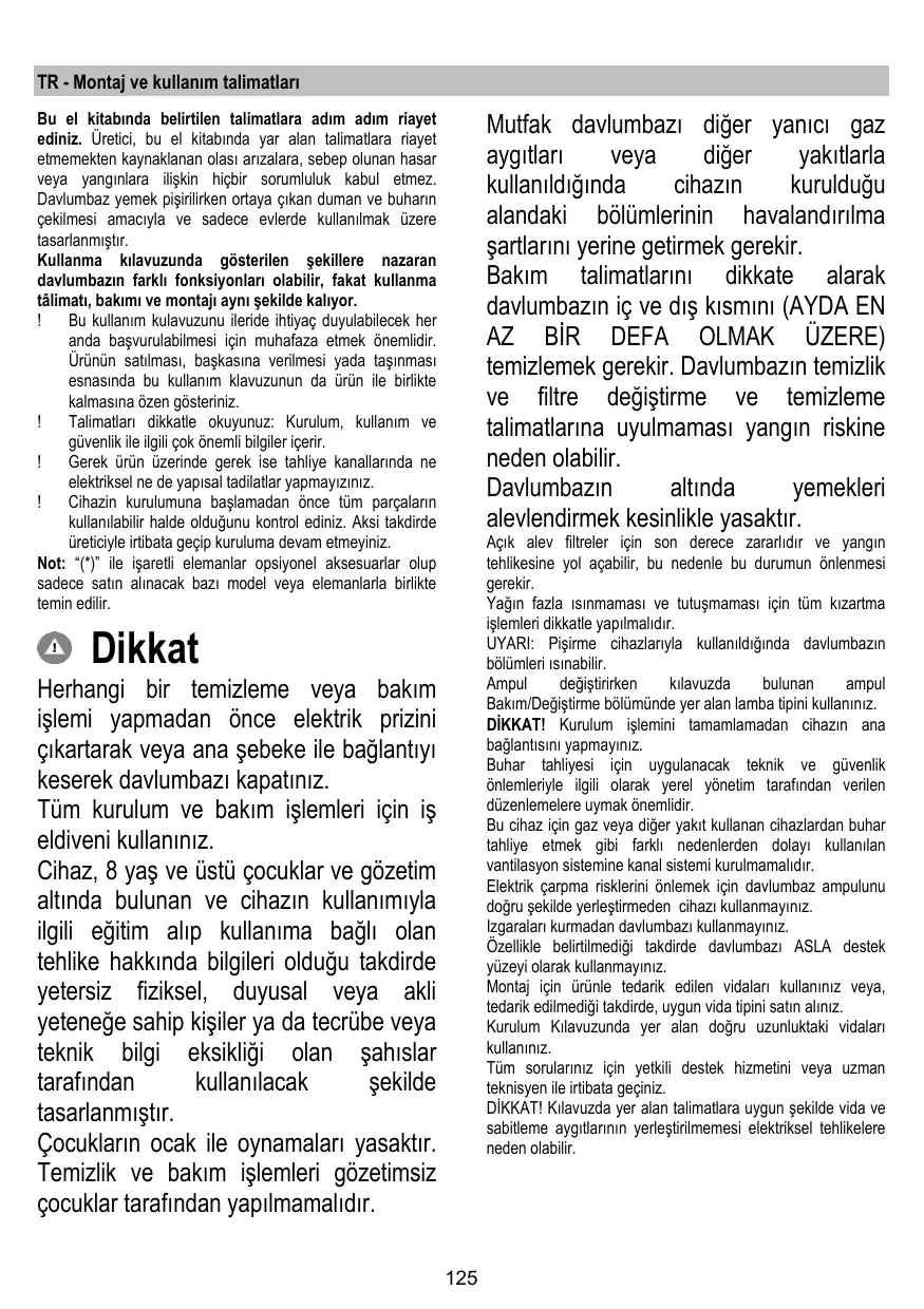 TR - Montaj ve kullanım talimatları Bu el kitabında belirtilen talimatlara adım adım riayet ediniz. Üretici, bu el kitabında yar alan talimatlara riayet etmemekten kaynaklanan olası arızalara, sebep olunan hasar veya yangınlara ilişkin hiçbir sorumluluk kabul etmez. Davlumbaz yemek pişirilirken ortaya çıkan duman ve buharın çekilmesi amacıyla ve sadece evlerde kullanılmak üzere tasarlanmıştır. Kullanma kılavuzunda gösterilen şekillere nazaran davlumbazın farklı fonksiyonları olabilir, fakat kullanma tâlimatı, bakımı ve montajı aynı şekilde kalıyor. Bu kullanım kulavuzunu ileride ihtiyaç duyulabilecek her anda başvurulabilmesi için muhafaza etmek önemlidir. Ürünün satılması, başkasına verilmesi yada taşınması esnasında bu kullanım klavuzunun da ürün ile birlikte kalmasına özen gösteriniz. Talimatları dikkatle okuyunuz: Kurulum, kullanım ve güvenlik ile ilgili çok önemli bilgiler içerir. Gerek ürün üzerinde gerek ise tahliye kanallarında ne elektriksel ne de yapısal tadilatlar yapmayızınız. Cihazin kurulumuna başlamadan önce tüm parçaların kullanılabilir halde olduğunu kontrol ediniz. Aksi takdirde üreticiyle irtibata geçip kuruluma devam etmeyiniz. Not: “(*)” ile işaretli elemanlar opsiyonel aksesuarlar olup sadece satın alınacak bazı model veya elemanlarla birlikte temin edilir. Mutfak davlumbazı diğer yanıcı gaz aygıtları veya diğer yakıtlarla kullanıldığında cihazın kurulduğu alandaki bölümlerinin havalandırılma şartlarını yerine getirmek gerekir. Bakım talimatlarını dikkate alarak davlumbazın iç ve dış kısmını (AYDA EN AZ BİR DEFA OLMAK ÜZERE) temizlemek gerekir. Davlumbazın temizlik ve filtre değiştirme ve temizleme talimatlarına uyulmaması yangın riskine neden olabilir. Davlumbazın altında yemekleri alevlendirmek kesinlikle yasaktır. Açık alev filtreler için son derece zararlıdır ve yangın tehlikesine yol açabilir, bu nedenle bu durumun önlenmesi gerekir. Yağın fazla ısınmaması ve tutuşmaması için tüm kızartma işlemleri dikkatle yapılmalıdır. UYARI: Pişirme cihazlarıyla kullanıldığında davlumbazın bölümleri ısınabilir. Ampul değiştirirken kılavuzda bulunan ampul Bakım/Değiştirme bölümünde yer alan lamba tipini kullanınız. DİKKAT! Kurulum işlemini tamamlamadan cihazın ana bağlantısını yapmayınız. Buhar tahliyesi için uygulanacak teknik ve güvenlik önlemleriyle ilgili olarak yerel yönetim tarafından verilen düzenlemelere uymak önemlidir. Bu cihaz için gaz veya diğer yakıt kullanan cihazlardan buhar tahliye etmek gibi farklı nedenlerden dolayı kullanılan vantilasyon sistemine kanal sistemi kurulmamalıdır. Elektrik çarpma risklerini önlemek için davlumbaz ampulunu doğru şekilde yerleştirmeden cihazı kullanmayınız. Izgaraları kurmadan davlumbazı kullanmayınız. Özellikle belirtilmediği takdirde davlumbazı ASLA destek yüzeyi olarak kullanmayınız. Montaj için ürünle tedarik edilen vidaları kullanınız veya, tedarik edilmediği takdirde, uygun vida tipini satın alınız. Kurulum Kılavuzunda yer alan doğru uzunluktaki vidaları kullanınız. Tüm sorularınız için yetkili destek hizmetini veya uzman teknisyen ile irtibata geçiniz. DİKKAT! Kılavuzda yer alan talimatlara uygun şekilde vida ve sabitleme aygıtlarının yerleştirilmemesi elektriksel tehlikelere neden olabilir. Dikkat Herhangi bir temizleme veya bakım işlemi yapmadan önce elektrik prizini çıkartarak veya ana şebeke ile bağlantıyı keserek davlumbazı kapatınız. Tüm kurulum ve bakım işlemleri için iş eldiveni kullanınız. Cihaz, 8 yaş ve üstü çocuklar ve gözetim altında bulunan ve cihazın kullanımıyla ilgili eğitim alıp kullanıma bağlı olan tehlike hakkında bilgileri olduğu takdirde yetersiz fiziksel, duyusal veya akli yeteneğe sahip kişiler ya da tecrübe veya teknik bilgi eksikliği olan şahıslar tarafından kullanılacak şekilde tasarlanmıştır. Çocukların ocak ile oynamaları yasaktır. Temizlik ve bakım işlemleri gözetimsiz çocuklar tarafından yapılmamalıdır.