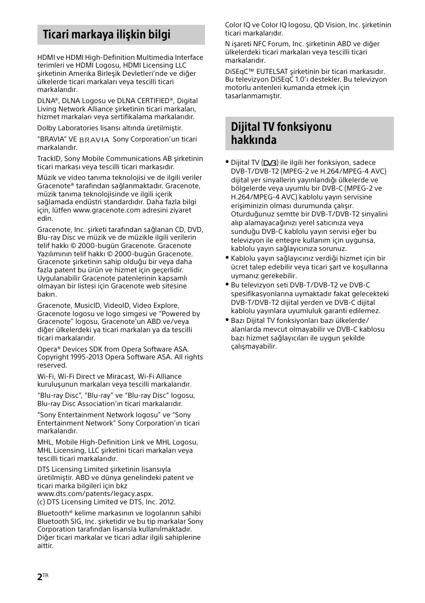 « BRAVIA » et Corporation. La technologie de reconnaissance des données audio/vidéo et les données associées sont fournies par Gracenote®. Gracenote constitue la norme de l’industrie en matière de technologie de reconnaissance musicale et de fourniture de contenus connexes. Pour plus de détails, visitez www.gracenote.com. Les données sur CD, DVD ou/et Blu-ray Disc et les données associées aux morceaux de musique et aux clips vidéo sont fournies par Gracenote, Inc., Copyright © 2000 - Date actuelle Gracenote. Logiciels Gracenote, Copyright © 2000 - Date actuelle Gracenote. Ce produit et ce service sont protégés par un ou plusieurs brevets appartenant à Gracenote. Pour obtenir une liste non exhaustive des brevets Gracenote en vigueur, visitez le site Web de Gracenote. Gracenote, MusicID, VideoID, Video Explore, le logo et le logo type Gracenote ainsi que le logo « Powered by Gracenote » sont des marques ou des marques déposées de Gracenote aux Etats-Unis et/ ou dans d’autres pays. Opera® Devices SDK from Opera Software ASA. Copyright 1995-2013 Opera Software ASA. All rights reserved. Wi-Fi, Wi-Fi Direct et Miracast sont des marques ou des marques déposées de Wi-Fi Alliance. « Blu-ray Disc », « Blu-ray » et le logo « Blu-ray Disc » sont des marques de Blu-ray Disc Association. Le logo « Sony Entertainment Network » et « Sony Entertainment Network » sont des marques de Sony Corporation. MHL, Mobile High-Definition Link et le logo MHL sont des marques ou des marques déposées de MHL Licensing, LLC. Fabriqué sous licence de DTS Licensing Limited. Pour plus d’informations sur les marques et les brevets aux Etats-Unis et à travers le monde, visitez www.dts.com/patents/legacy.aspx. (c) DTS Licensing Limited et DTS, Inc. 2012.