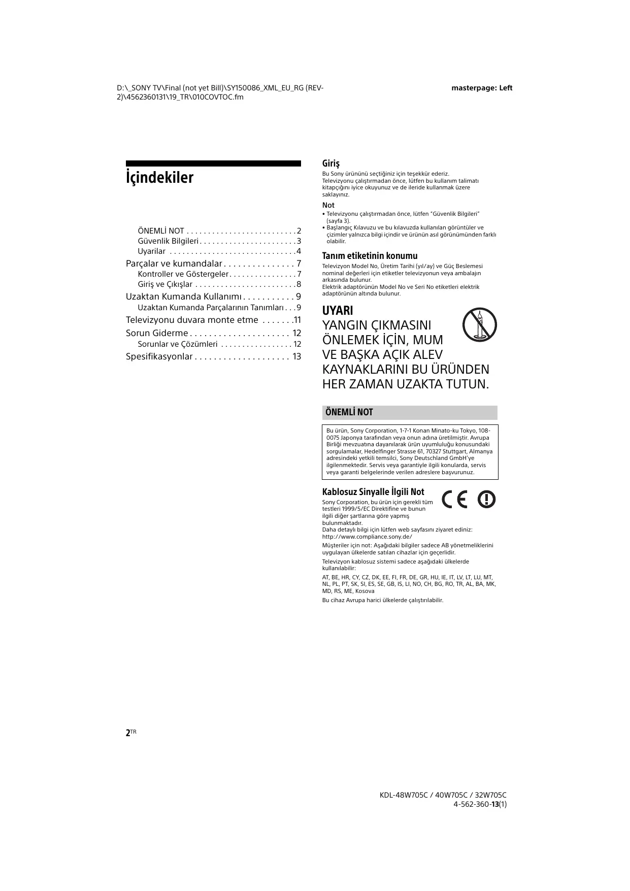HER ZAMAN UZAKTA TUTUN. ÔNEMLI NOT Bu ürün, Sony Corparation, 1-71 Konan Minato-ku Tokyo, 108- 0075 laponya taratindan veya onun adina üretilmisti. Avrupa Birigi mevzuatina dayanilarak ürün uyumluluäu konusundaki sorgulamalar, Hedelfinger Strasse 61, 10327 Stuttgart, Almanya adresindeki yetkili temsili, Sony Deutschland GmbH'ye ilgilenmektedir. Servis veya garantiyle ilgili konularda, servis veya garanti belgelerinde verilen adreslere basvurunuz. Kablosuz Sinyalle ilgili Not Sony Corporation, bu ürün için gerekitüm testleri 1999/S/EC Direktfine ve bunun gli diger sartlanna gôre yaprmis bulunmaktadir. Daha detayh bilgi için lütfen web sayfasini ziyaret ediniz ttp://mww.compliance sony.de/ Müsteriler için not: Agagidaki bilgiler sadece AB yônetmelklerini uygulayan ülkelerde satlan cihazlar için geçerldi. Televizyon kablosuz sistemi sadece açaäidaki ülkelerde kullanilabilir AT,BE, HR, CY, CZ, DK, EE, FI FR, DE, GR, HU, IE, IT, LV. LT, LU, MT, NL, PL, PT, SK, SI, ES, SE, GB, IS, LI, NO, CH, BG, RO, TR, AL, BA, MK, MD, RS, ME, Kosova Bu cihaz Avrupa harci ülkelerde çaltrlabilir KDL-48W705C / 40W705C / 32W705C 4-562-360-13(1)