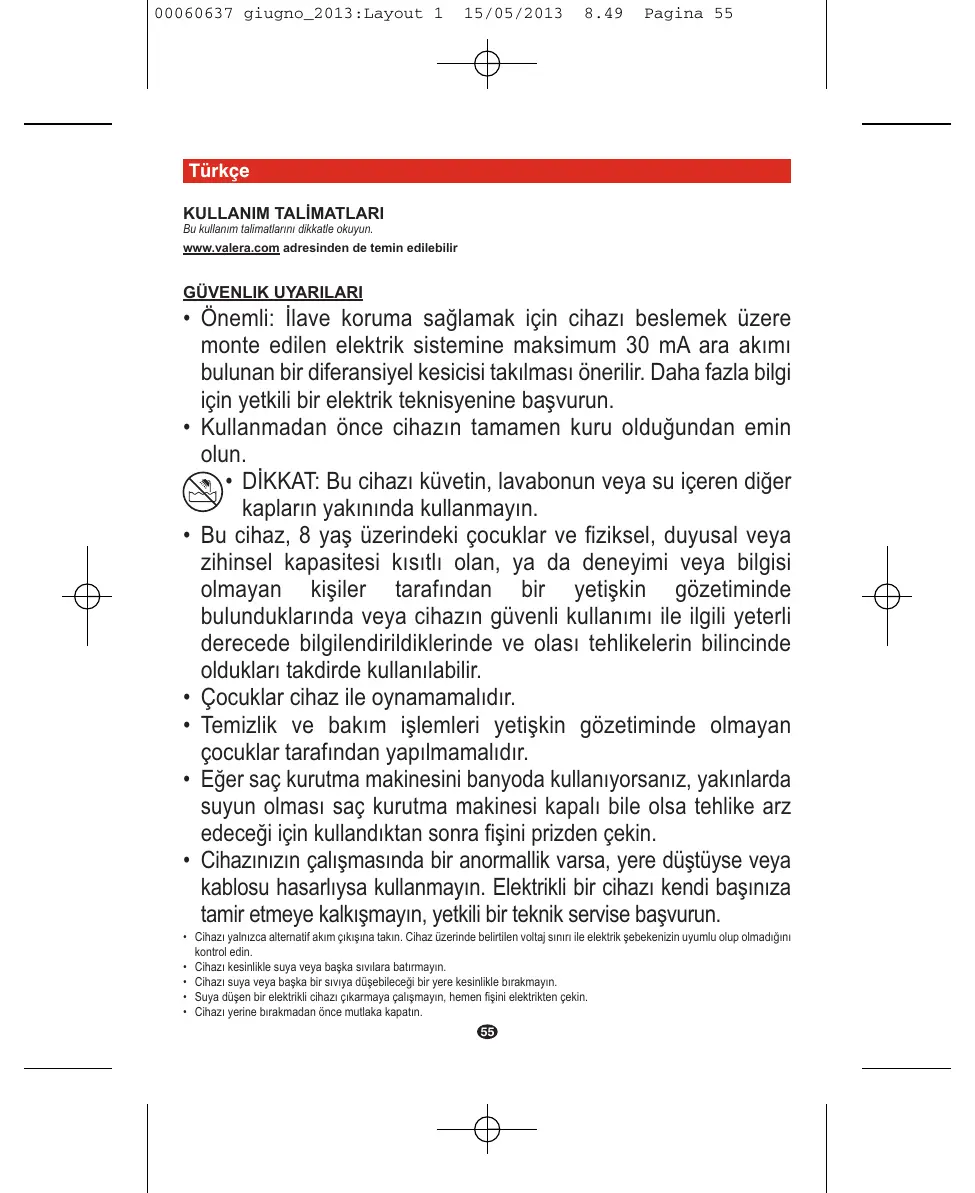 Türkçe KULLANIM TALİMATLARI Bu kullanım talimatlarını dikkatle okuyun. www.valera.com adresinden de temin edilebilir