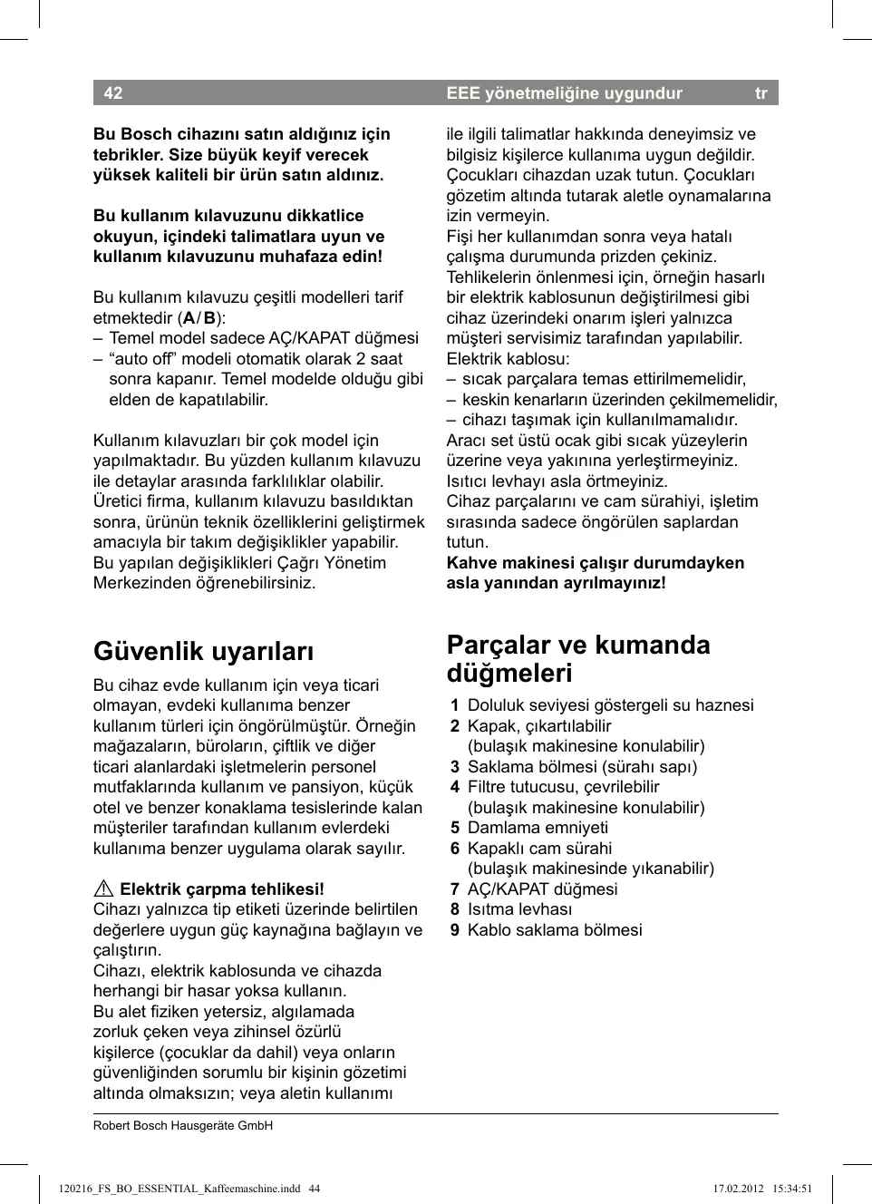 42 Bu Bosch cihazını satın aldığınız için tebrikler. Size büyük keyif verecek yüksek kaliteli bir ürün satın aldınız. Bu kullanım kılavuzunu dikkatlice okuyun, içindeki talimatlara uyun ve kullanım kılavuzunu muhafaza edin! Bu kullanım kılavuzu çeşitli modelleri tarif etmektedir (A / B): – Temel model sadece AÇ/KAPAT düğmesi – “auto off” modeli otomatik olarak 2 saat sonra kapanır. Temel modelde olduğu gibi elden de kapatılabilir. Kullanım kılavuzları bir çok model için yapılmaktadır. Bu yüzden kullanım kılavuzu ile detaylar arasında farklılıklar olabilir. Üretici irma, kullanım kılavuzu basıldıktan sonra, ürünün teknik özelliklerini geliştirmek amacıyla bir takım değişiklikler yapabilir. Bu yapılan değişiklikleri Çağrı Yönetim Merkezinden öğrenebilirsiniz.